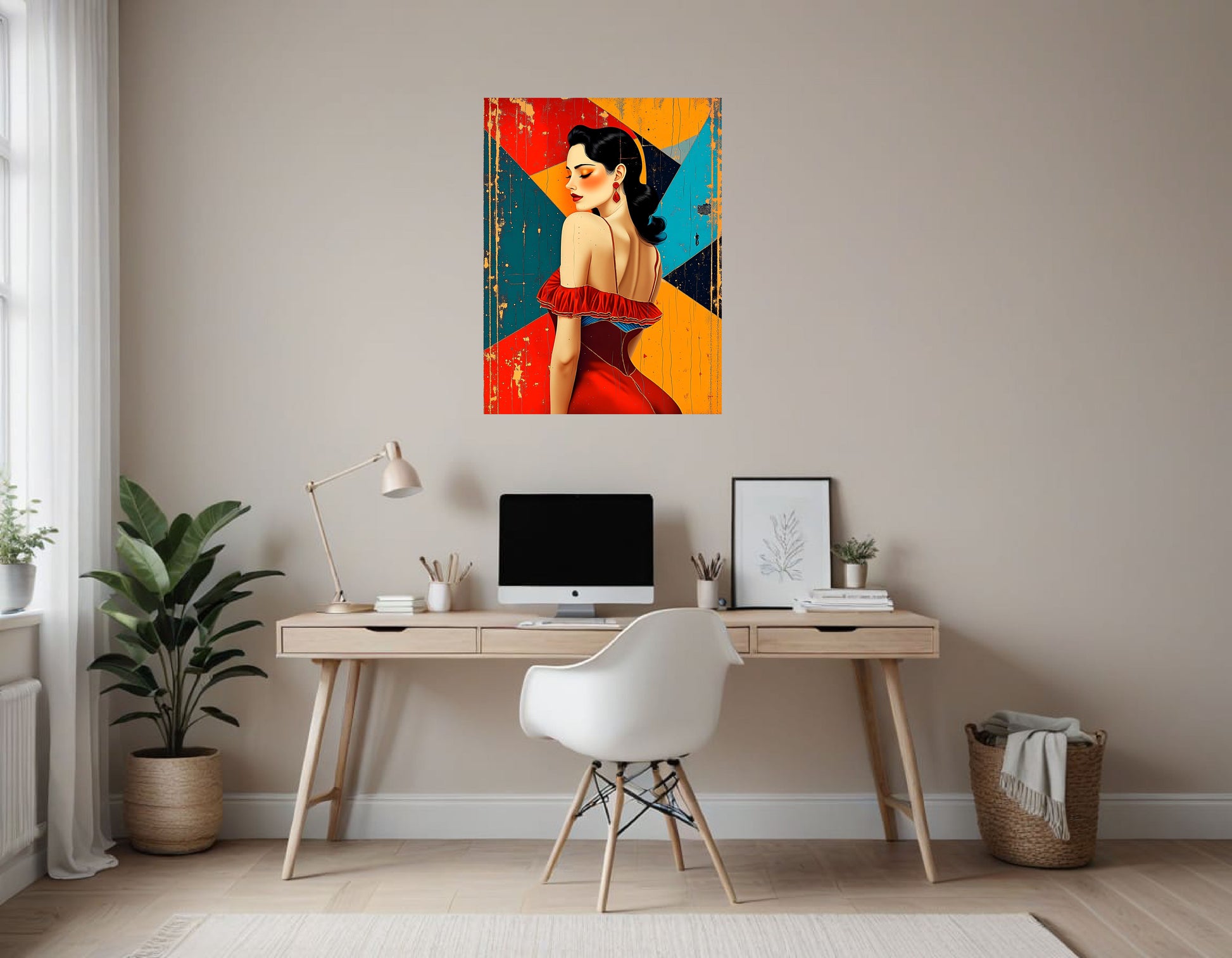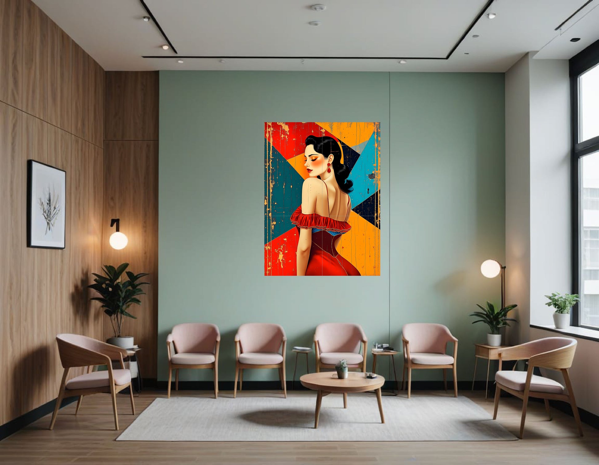 The background is composed of radiating geometric shapes, primarily triangles, in a palette of red, orange, teal, and black. The colors exhibit a distressed, grunge-like texture with splatters and crackling, giving the artwork a retro, weathered appearance. The right and left edges of the painting have drips of color. The composition evokes a mid-century modern feel, blending classic glamour with an aged, urban sensibility.