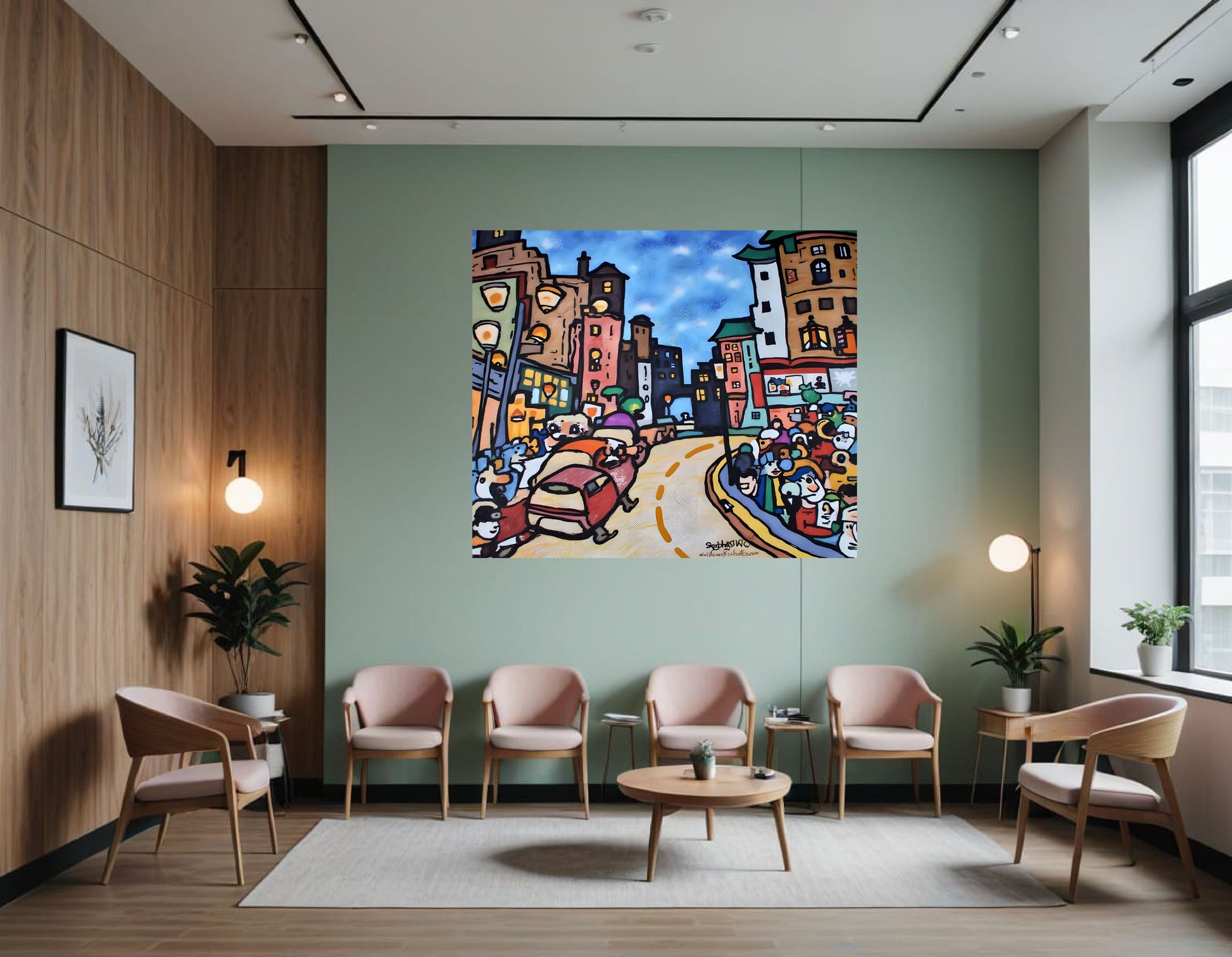 The painting depicts a vibrant and stylized city street scene, rendered in a cartoonish manner. The perspective is skewed and slightly distorted, enhancing the whimsical feel. Buildings of various heights and colors line the street, featuring exaggerated architectural details such as uneven windows, curved rooftops, and a mix of Asian-inspired and Western styles.