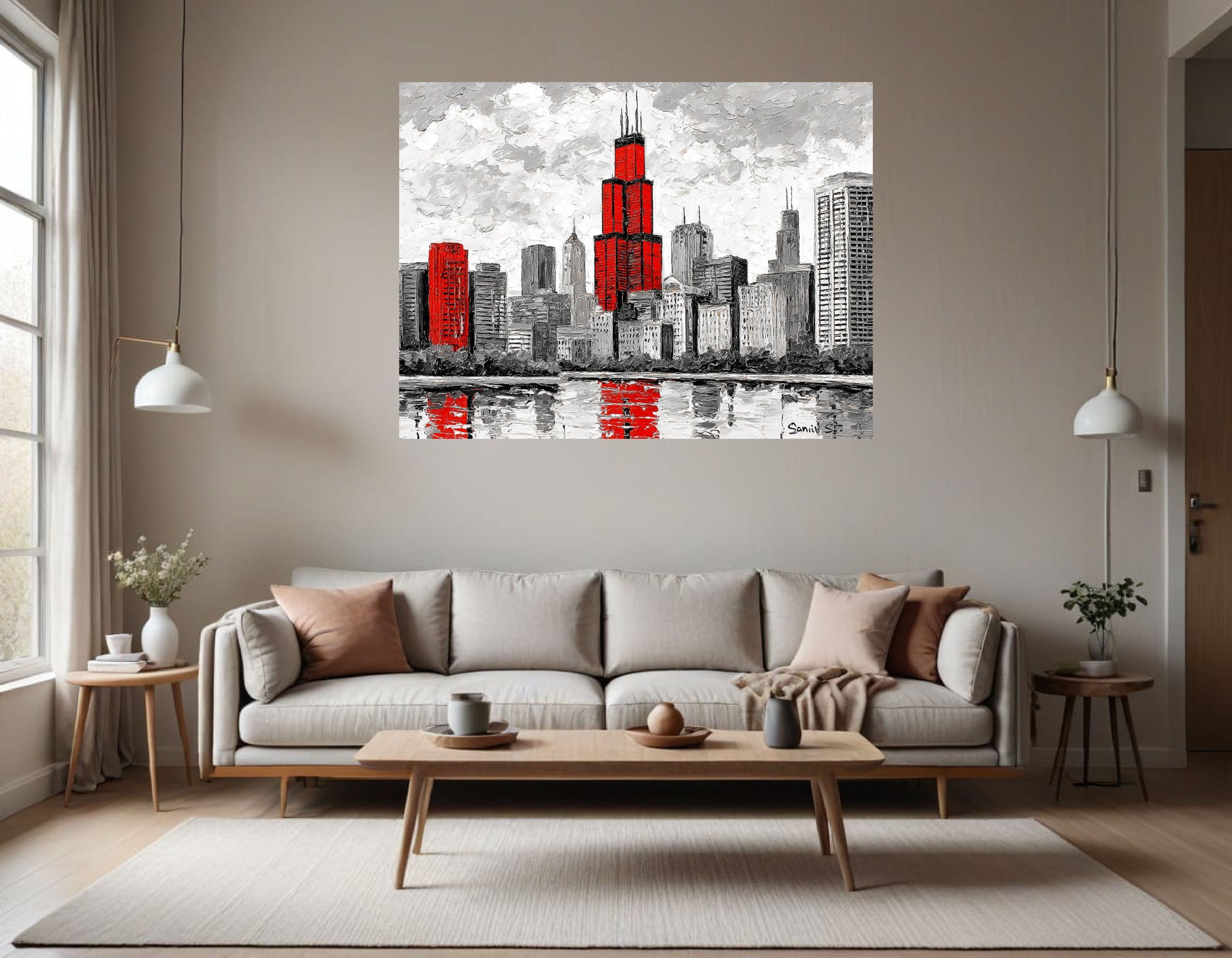 The composition showcases several iconic Chicago skyscrapers. The most prominent feature is the bright red Willis (formerly Sears) Tower, centrally positioned and rising high above the other buildings. To the left, another skyscraper is similarly colored in red, creating a visual balance within the cityscape. The remaining buildings are rendered in various shades of gray and white, contributing to the overall contrast and drama of the piece.