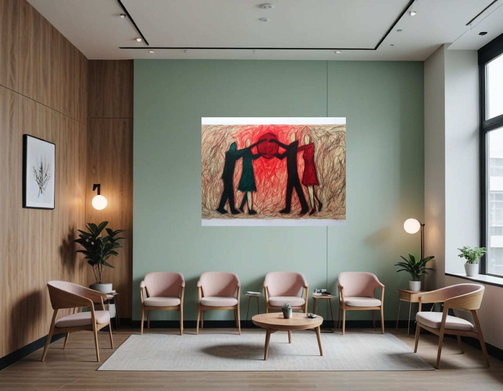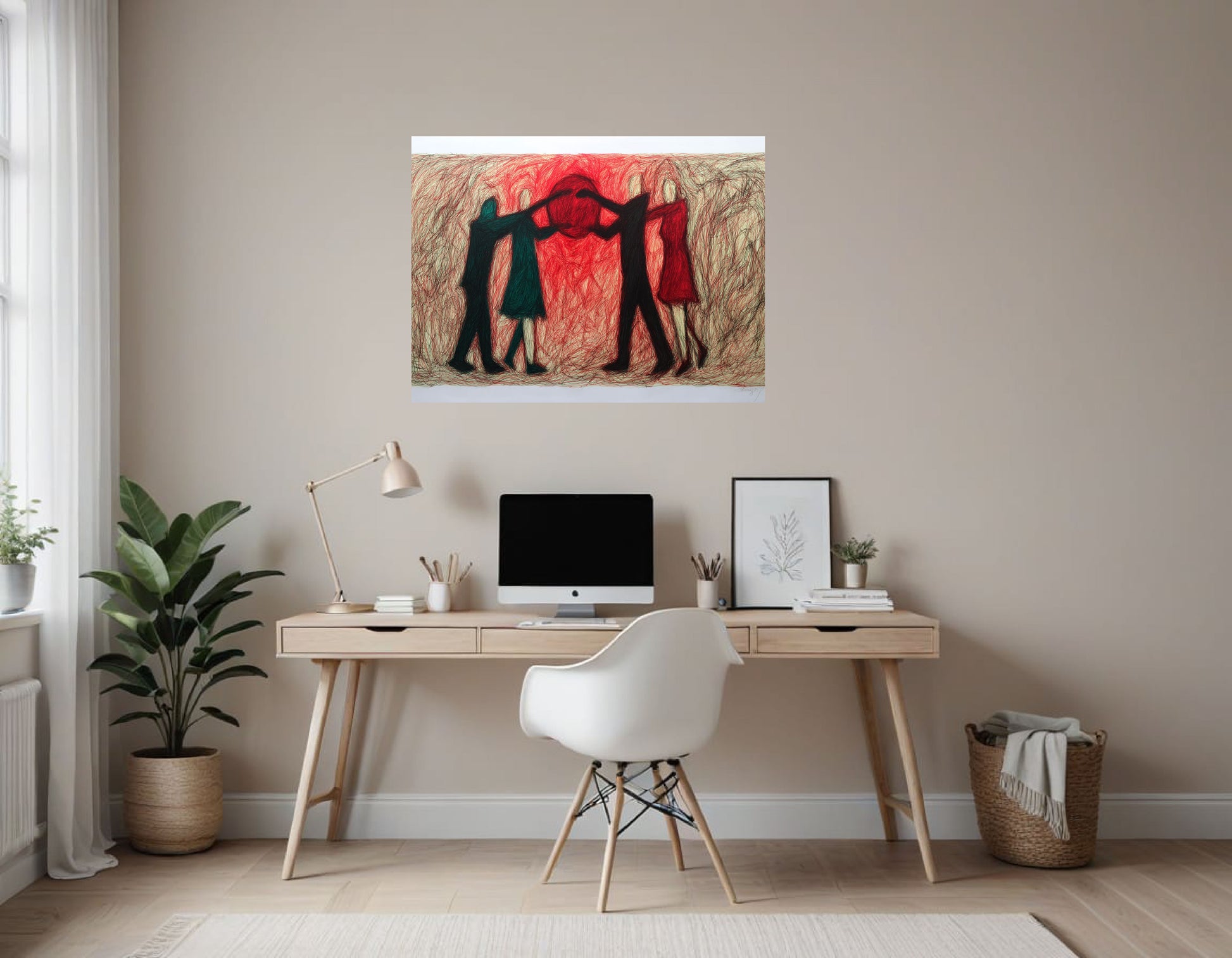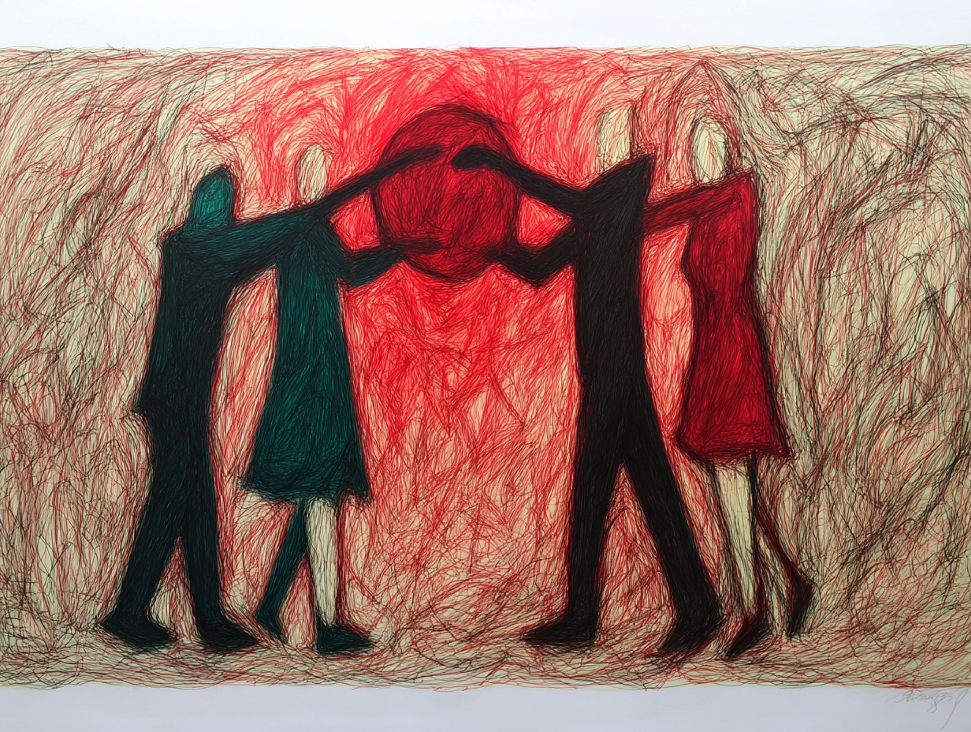 Red Sphere: This is the focal point of the image. It's a large, circular shape filled with densely packed red lines, creating a vibrant and energetic presence. It seems to be suspended in the center of the composition, and the figures are positioned around it.