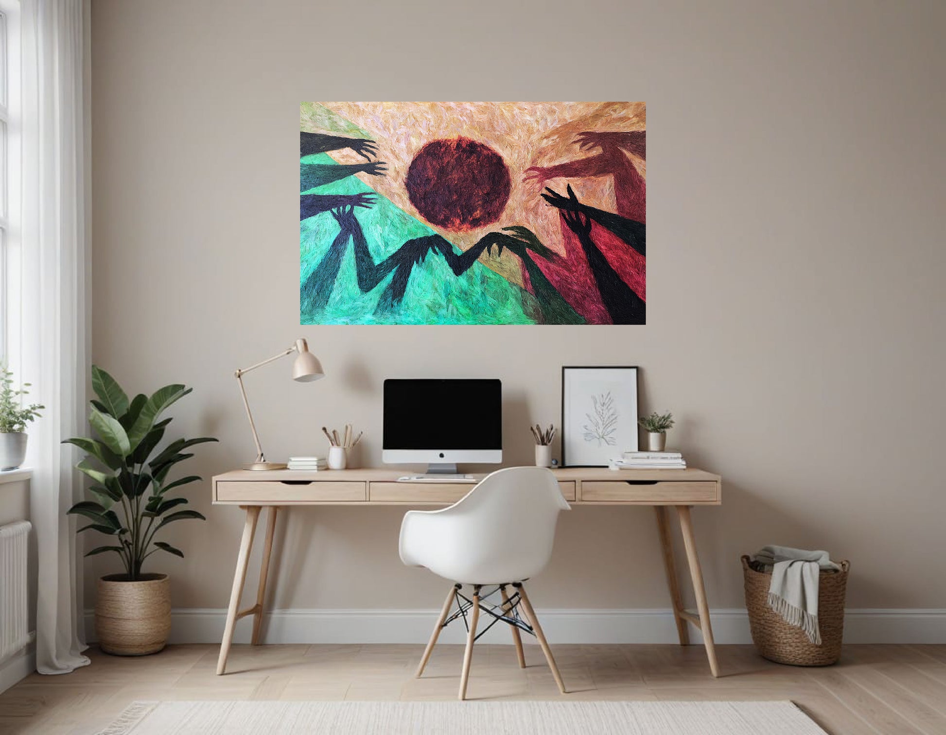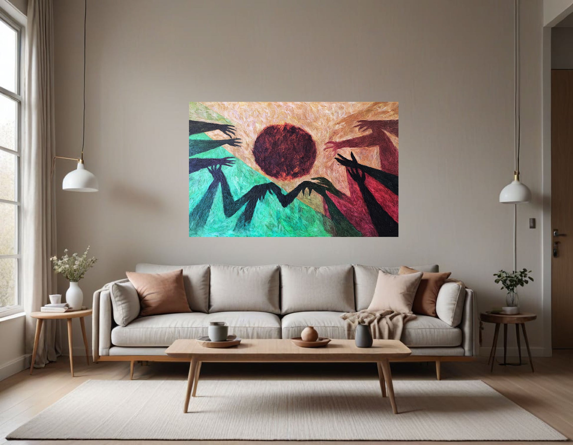 Overall Impression: The painting evokes a sense of drama and mystery. The contrast between the warm orb and the darker figures and hands creates a tension that draws the viewer's eye. The textured surface and the bold use of color contribute to a feeling of emotional intensity. The reaching hands suggest themes of aspiration, longing, or even struggle towards the central orb, which might symbolize enlightenment, hope, or some other higher power. The rough, expressive brushwork adds to the overall sense of raw emotion.