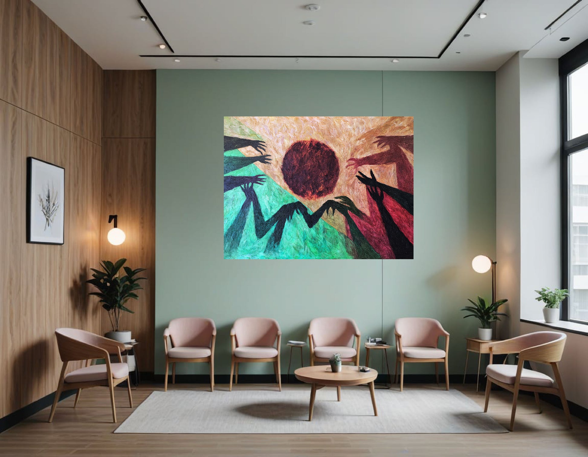 Silhouetted Figures/Hands: Around the central orb, multiple silhouetted arms and hands reach upwards. These limbs are rendered in dark tones, ranging from deep black to dark red and dark green, which create a sense of depth. The abstract nature of the hands adds a somewhat mysterious and evocative element.
