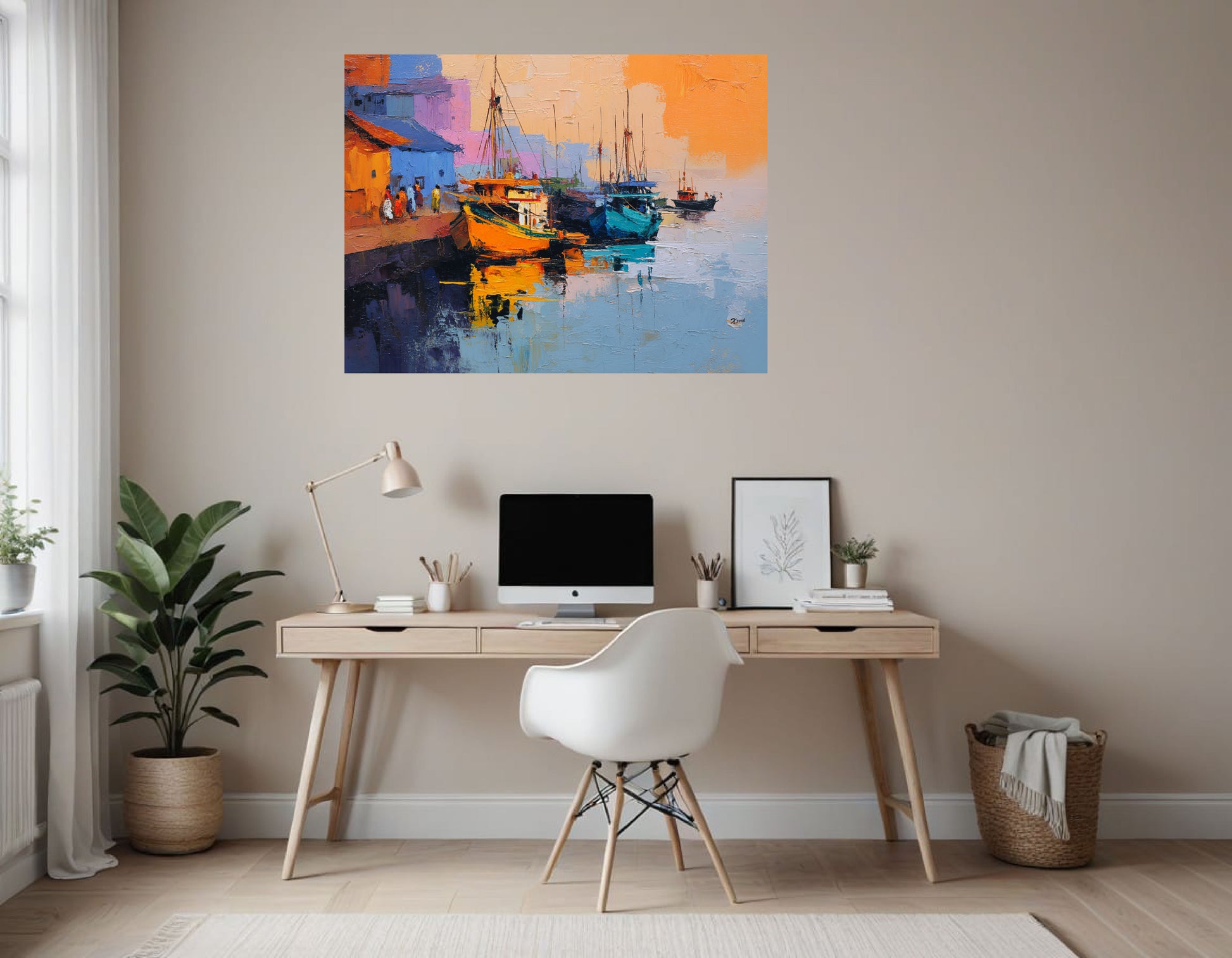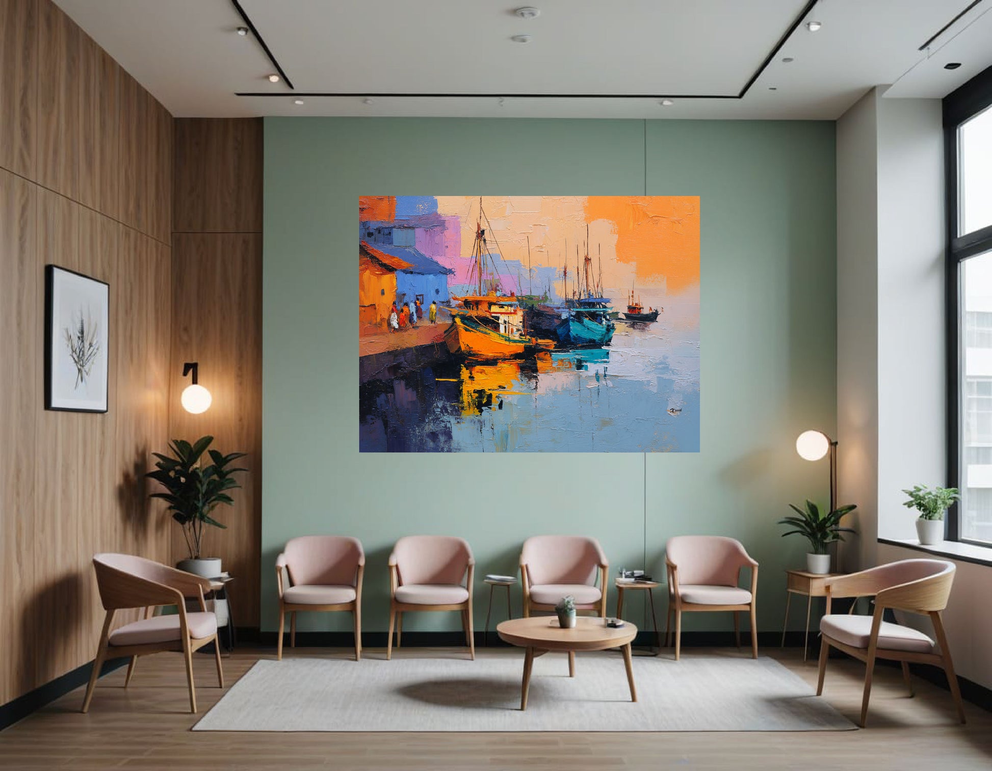 This digital painting depicts a lively harbor scene rendered in a vibrant, impressionistic style. The composition centers on several brightly colored boats moored along a dock. The boats are painted in bold hues of orange, yellow, blue, and turquoise, their reflections shimmering vividly in the calm water below. The use of thick, textured brushstrokes brings a tactile quality to both the boats and their mirrored images, adding dynamism to the scene.