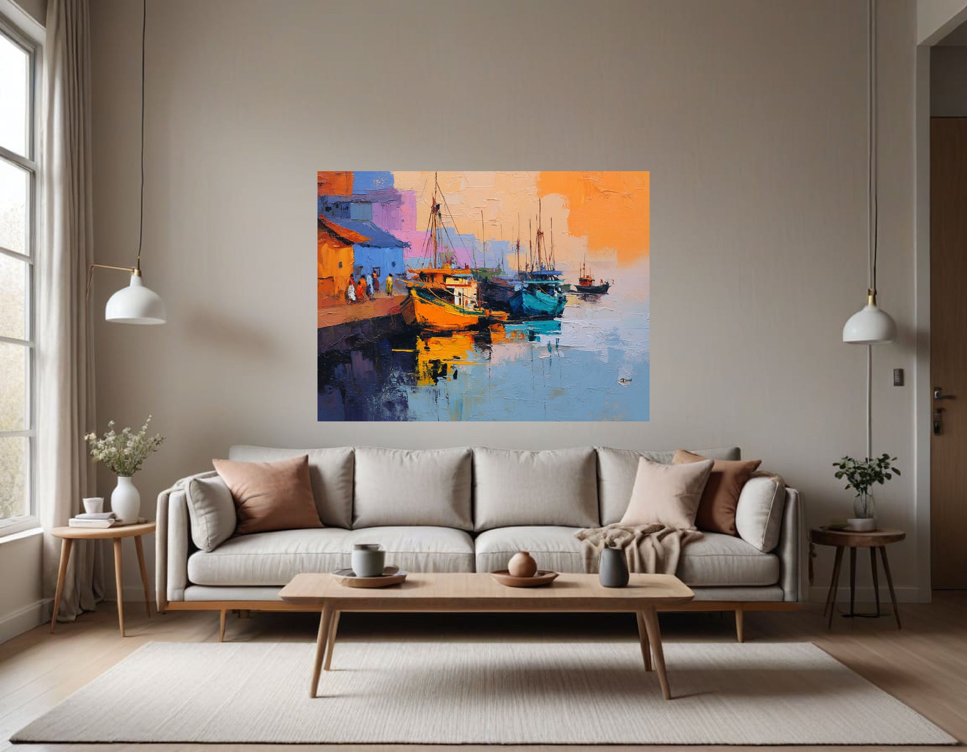 To the left, on the dock, a cluster of small buildings is painted in warm oranges, deep blues, and soft pinks. A few small figures in colorful clothing gather near the buildings, hinting at the daily life of a coastal village. The sky is bathed in soft orange and peach tones, suggesting either the early light of dawn or the golden glow of sunset, which fills the scene with warmth.