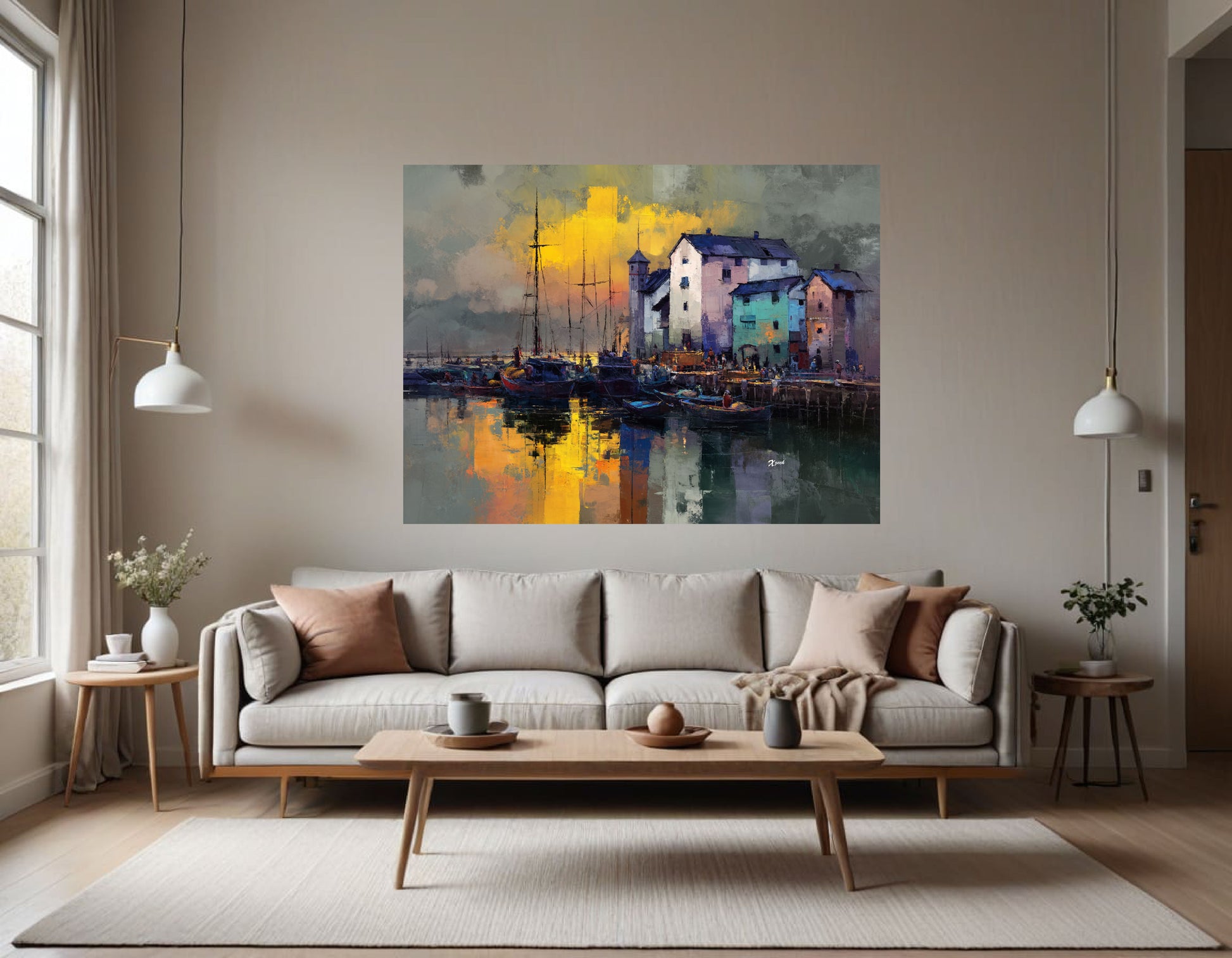 The sky is filled with a hazy mix of greys and yellows, hinting at either the start or end of the day, and casting a warm glow over the entire scene. The brushwork is loose and expressive, contributing to the overall impressionistic style of the painting. The water reflects the warm light and colors of the boats and sky, creating a unified and vibrant scene. A signature is visible on the lower right corner of the painting.