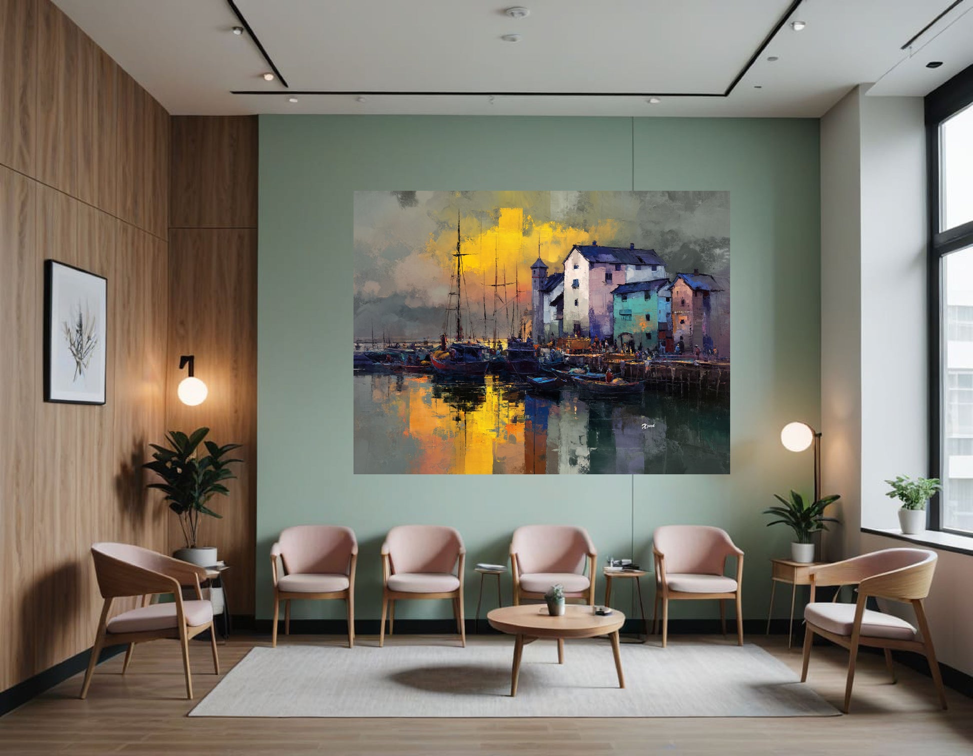 The digital painting is an impressionistic depiction of a bustling harbor scene, likely at sunrise or sunset. The composition is dominated by a cluster of boats in the foreground, with their masts reaching towards the sky. The boats are rendered in a variety of colors, including reds, blues, and oranges, with their reflections visible in the water below.