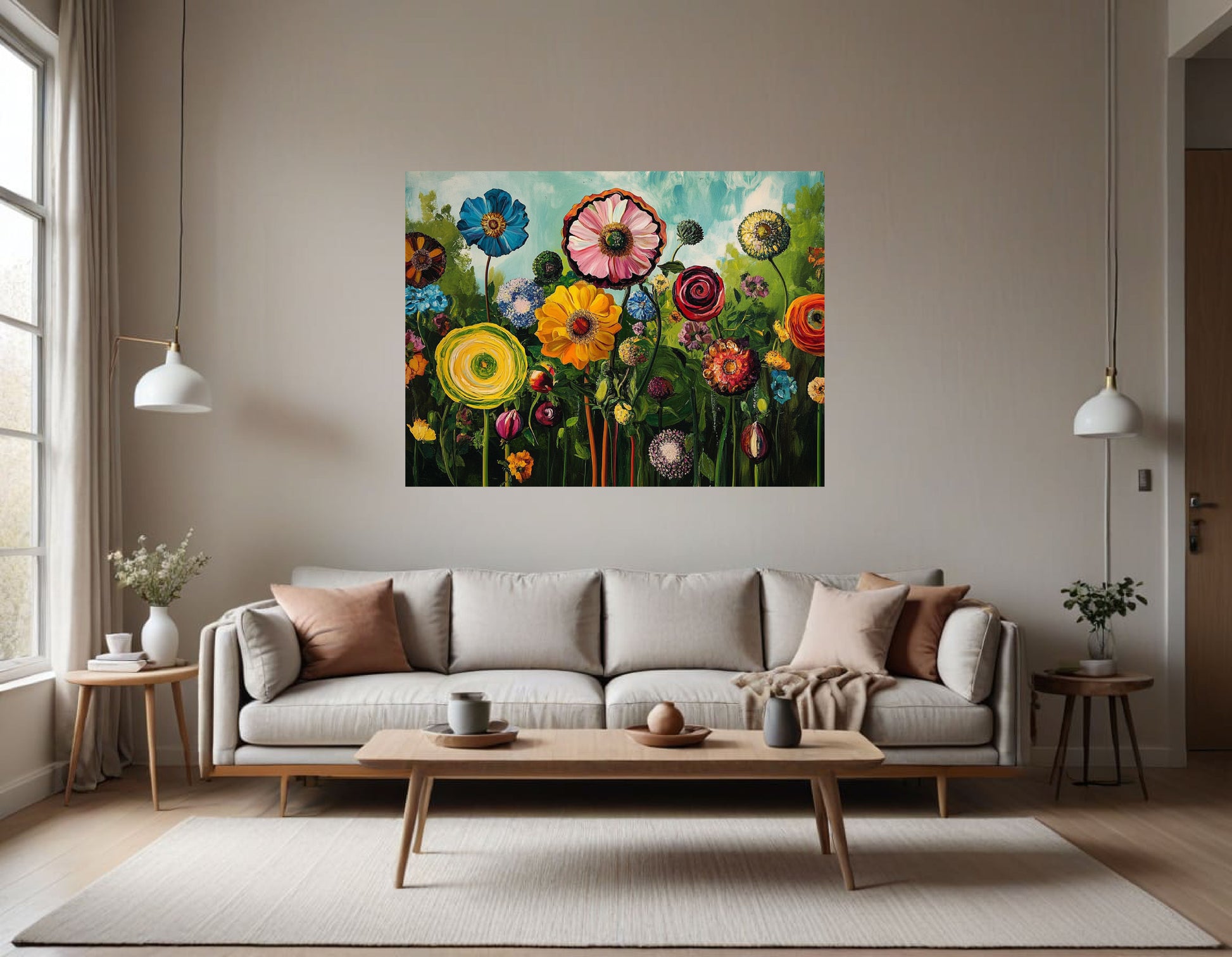 Color Palette: The color palette is bold and vibrant, with strong contrasts between the various flowers and foliage. The sky is a light blue, which contrasts with the intense colors of the flowers.