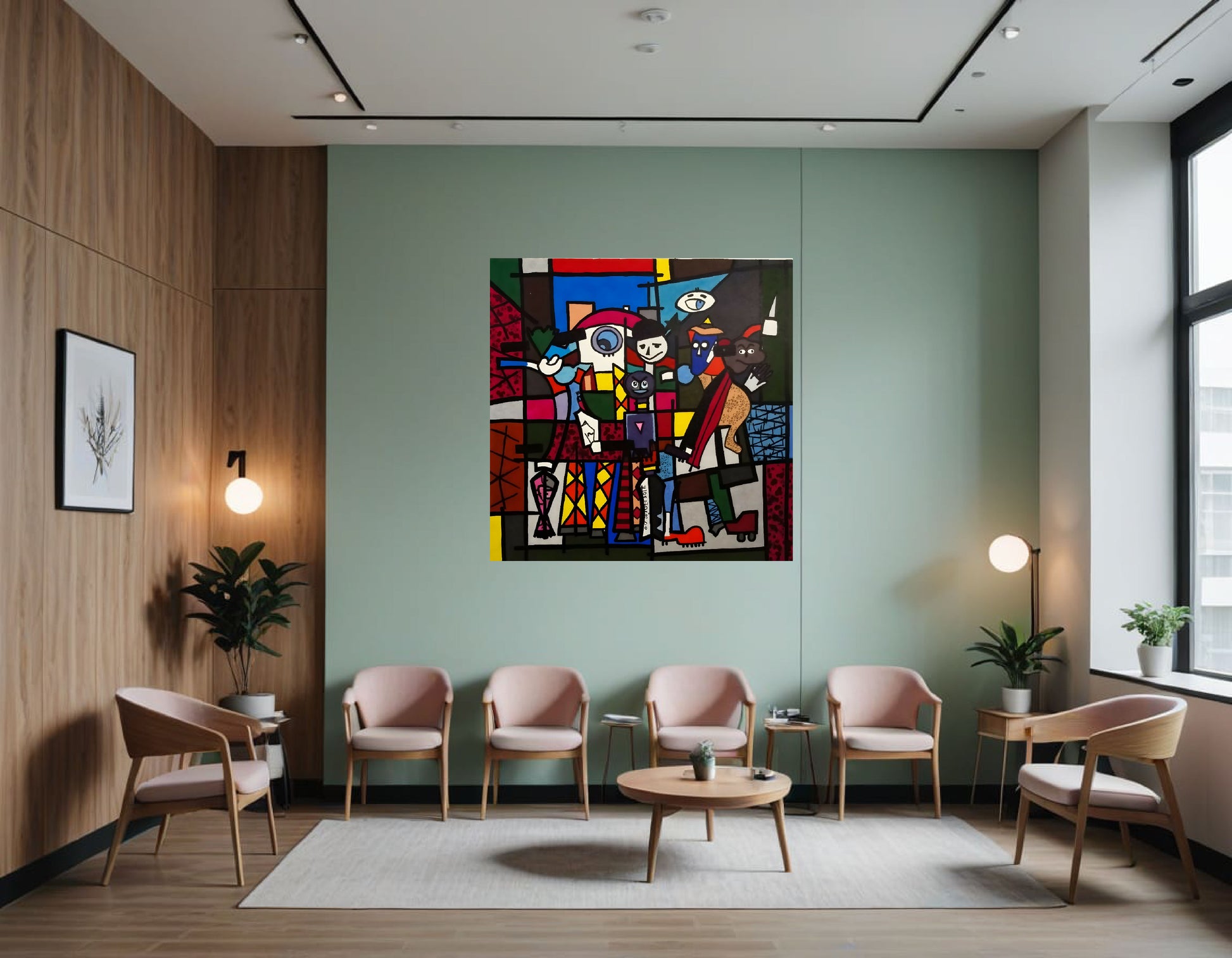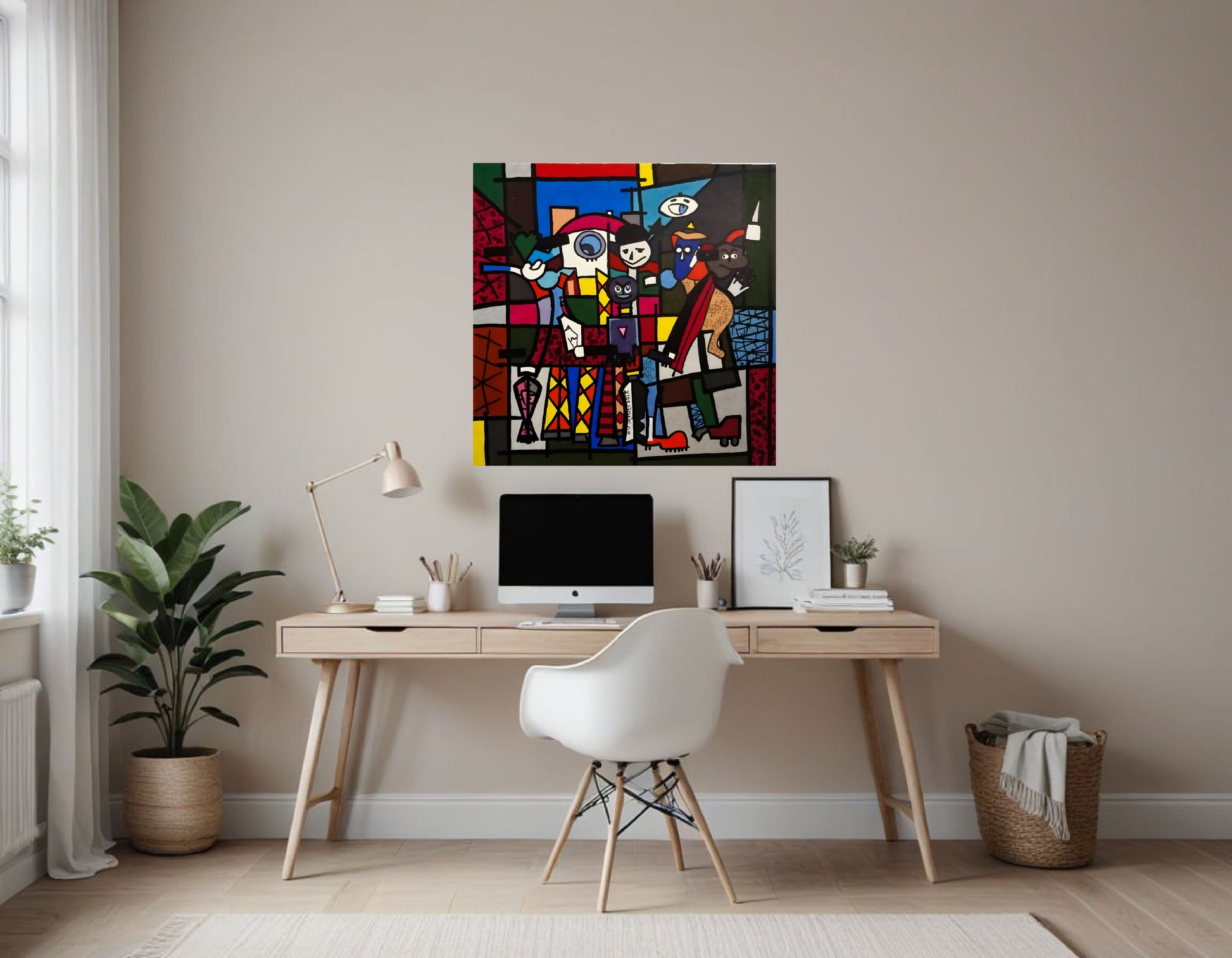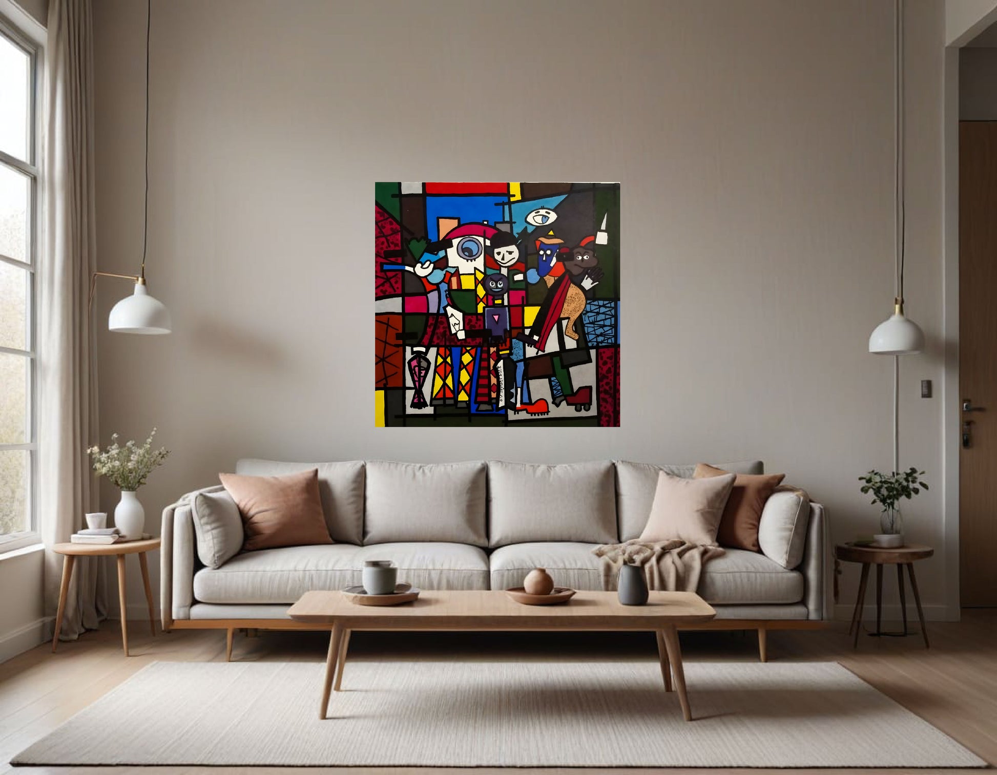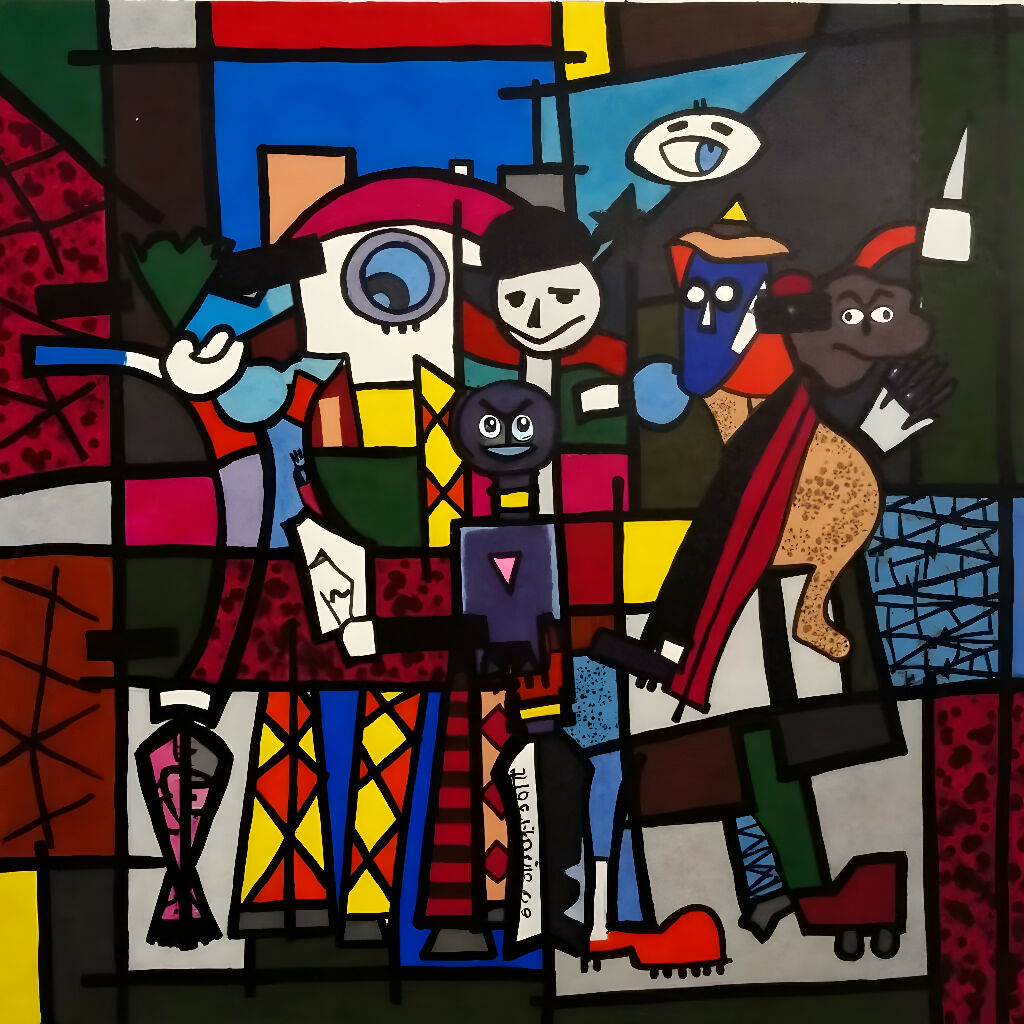 The image is a vibrant, abstract painting in a style reminiscent of Neo-Primitivism or even a playful take on Cubism. It depicts a group of stylized figures, seemingly interacting within a fragmented, geometric space. The figures are cartoonish and somewhat whimsical, with exaggerated features and simplified forms. They are rendered in bold, flat colors — bright reds, blues, greens, yellows, and blacks — with thick, black outlines defining their shapes. The background is a collage of geometric shapes and blocks of color, contributing to the fragmented and layered composition.