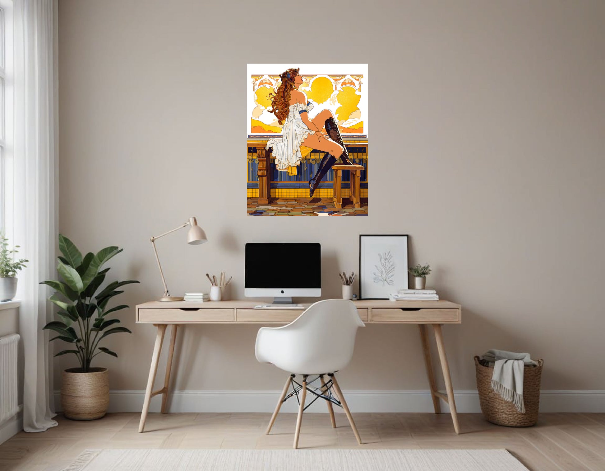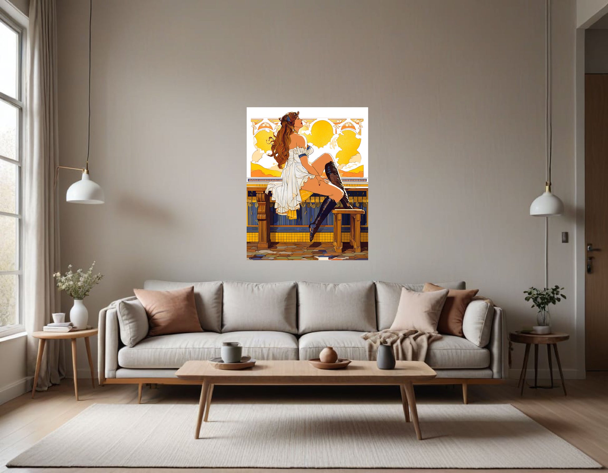 She is seated on a wooden surface, with a portion of her legs covered by high, black leather boots. The background displays an elaborate design with golden circles representing the sun or moon and stylized clouds. A frieze with geometric patterns runs along the upper edge.