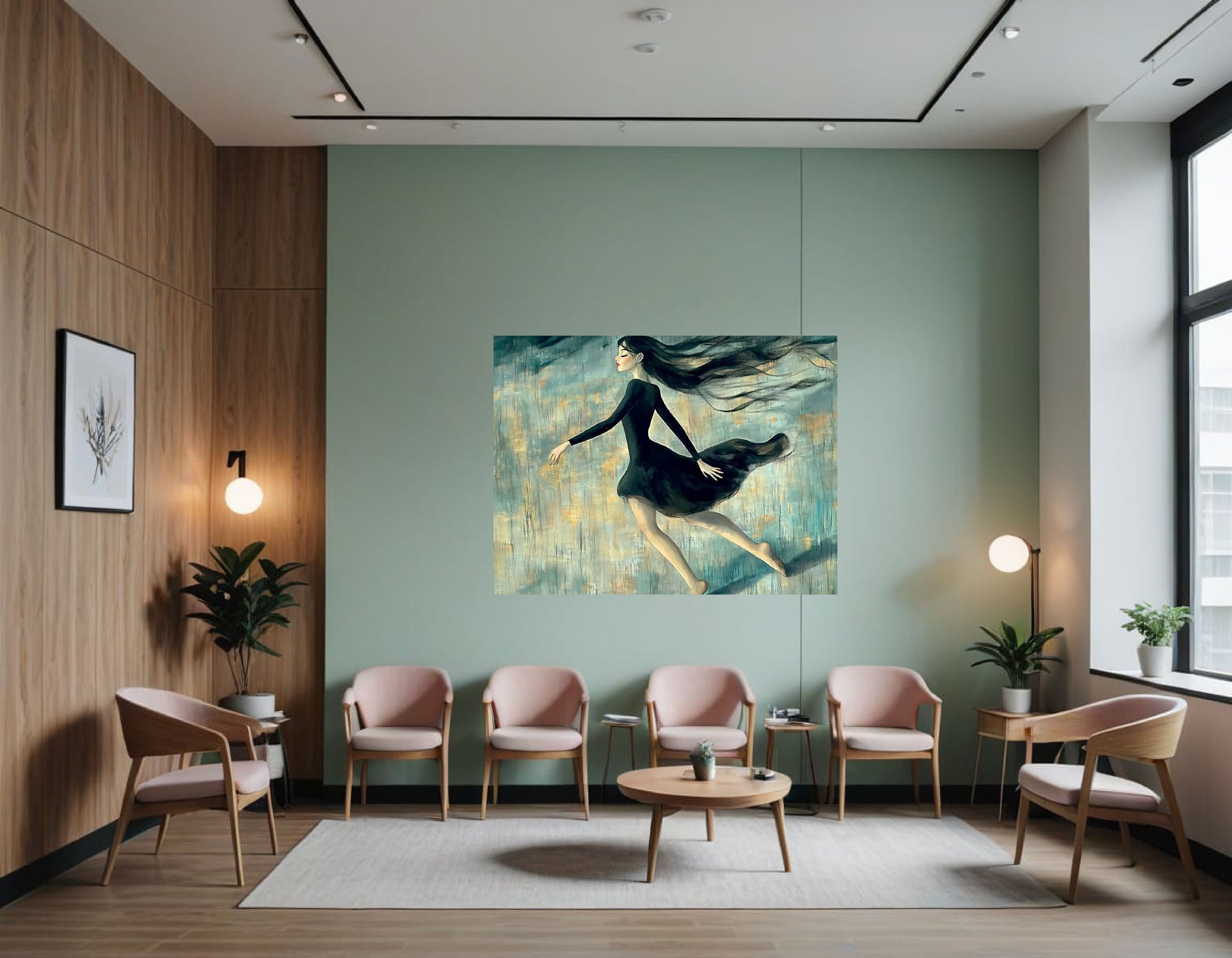 The digital painting presents a delicate, ethereal scene featuring a woman in motion. She wears a flowing black dress that billows around her, accentuating her graceful movement. Her long, dark hair streams behind, blending with the cool-toned, abstract background. The backdrop is painted with painterly strokes of blue, teal, and hints of soft gold, creating an impression of wind or rain, and infusing the scene with a dreamlike atmosphere. The woman's barefoot stride and outstretched arms evoke a sense of freedom and lightness, as though she is walking on air or dancing through an unseen landscape. The overall style is whimsical and expressive, blending elements of realism and abstraction to convey both movement and emotion.