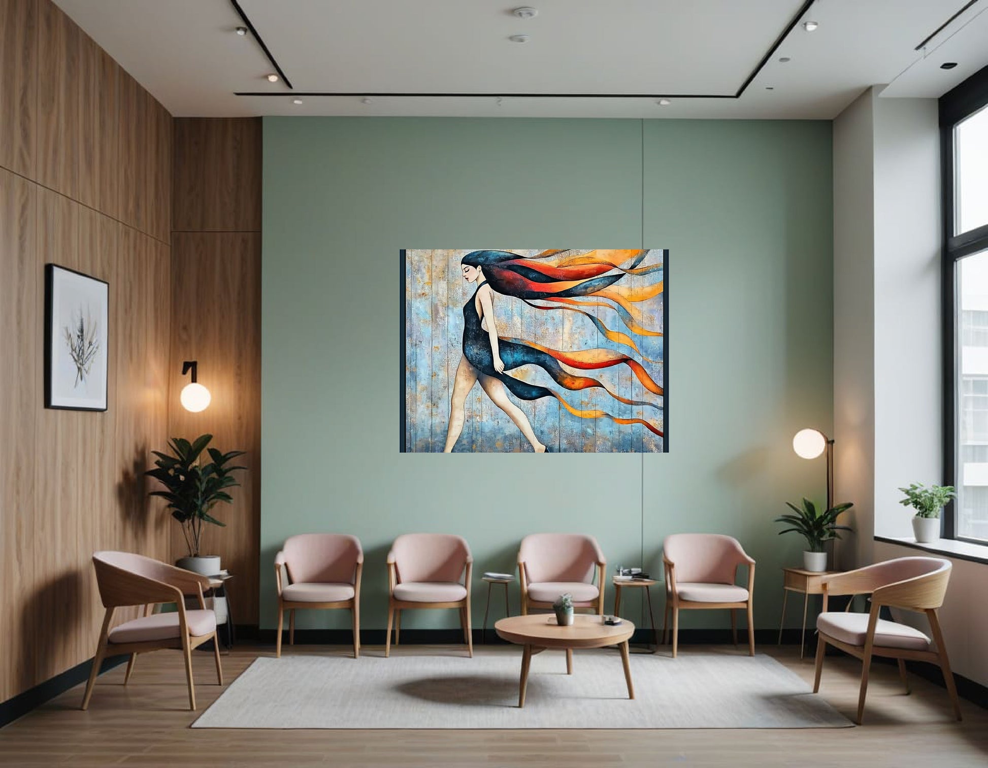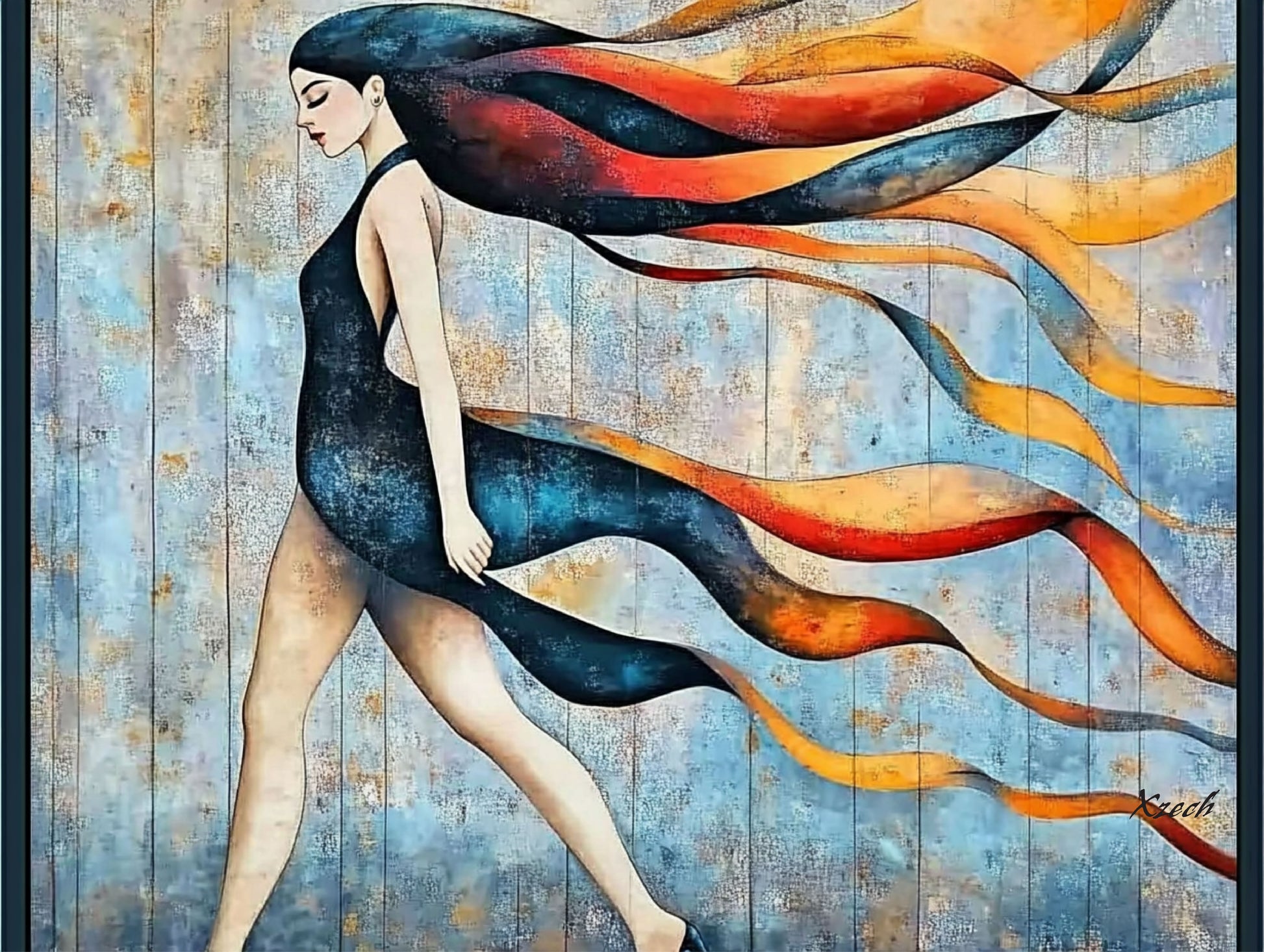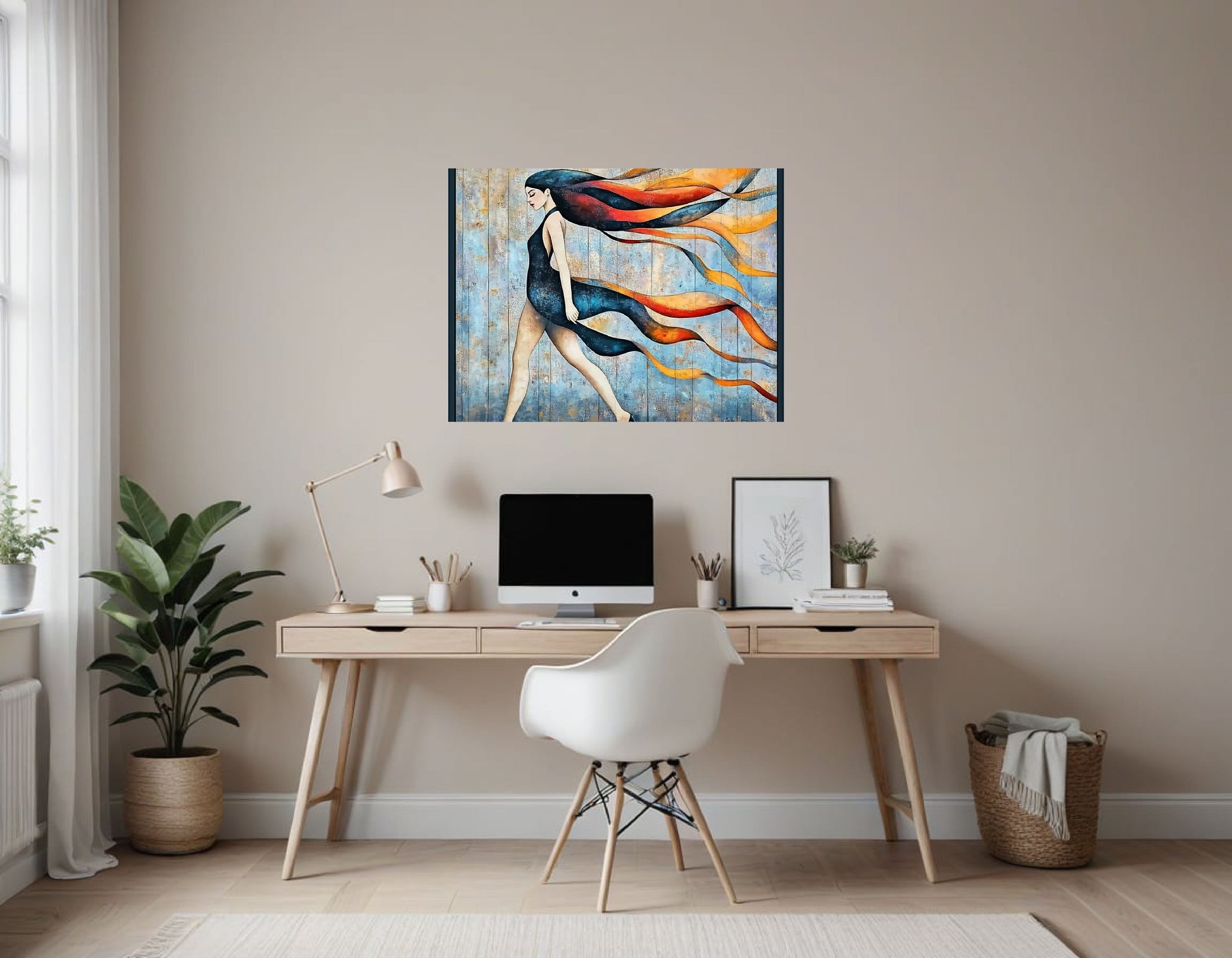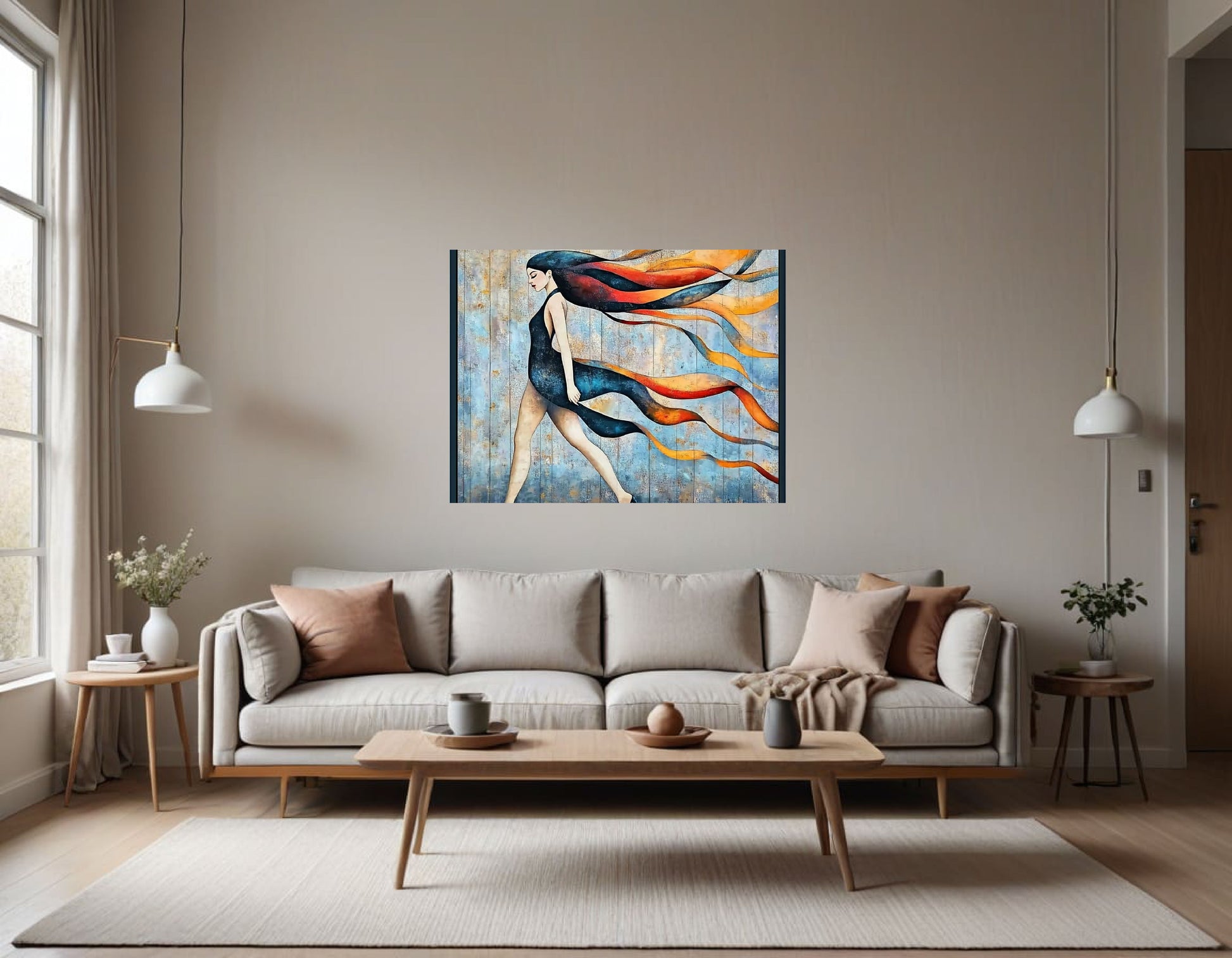 The composition emphasizes movement, with the flowing elements giving a sense of wind or dynamic speed, as if the woman is moving powerfully forward against a gentle breeze. Her bare feet and elongated limbs contribute to a graceful, almost ethereal quality. The background, with its weathered, abstract surface and vertical lines, provides subtle texture and depth, enhancing the overall dreamlike and expressive mood of the piece. The blending of realistic and abstract elements invites viewers to interpret the painting as both a celebration of feminine strength and the beauty of motion itself.