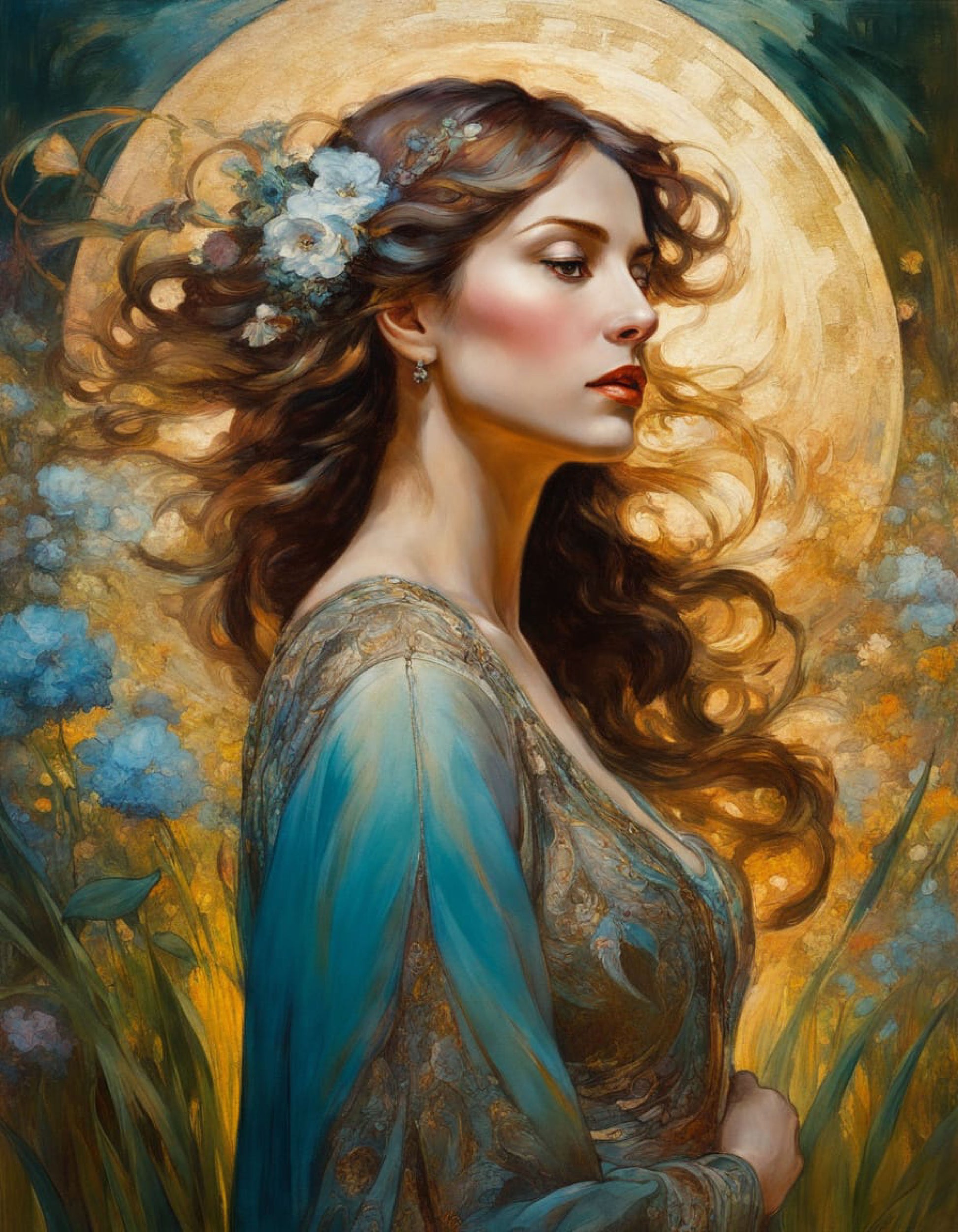 The painting presents a profile portrait of a woman with flowing, auburn hair adorned with delicate blue flowers. She possesses fair skin, rosy cheeks, and striking red lips. Her gaze is directed off to the side, conveying a sense of contemplation or wistful longing. She wears a blue and gold dress with intricate detailing that suggests an ornate design.