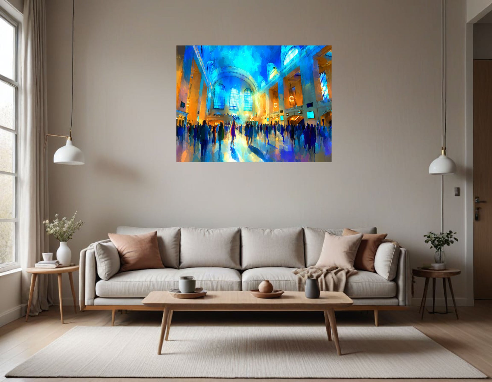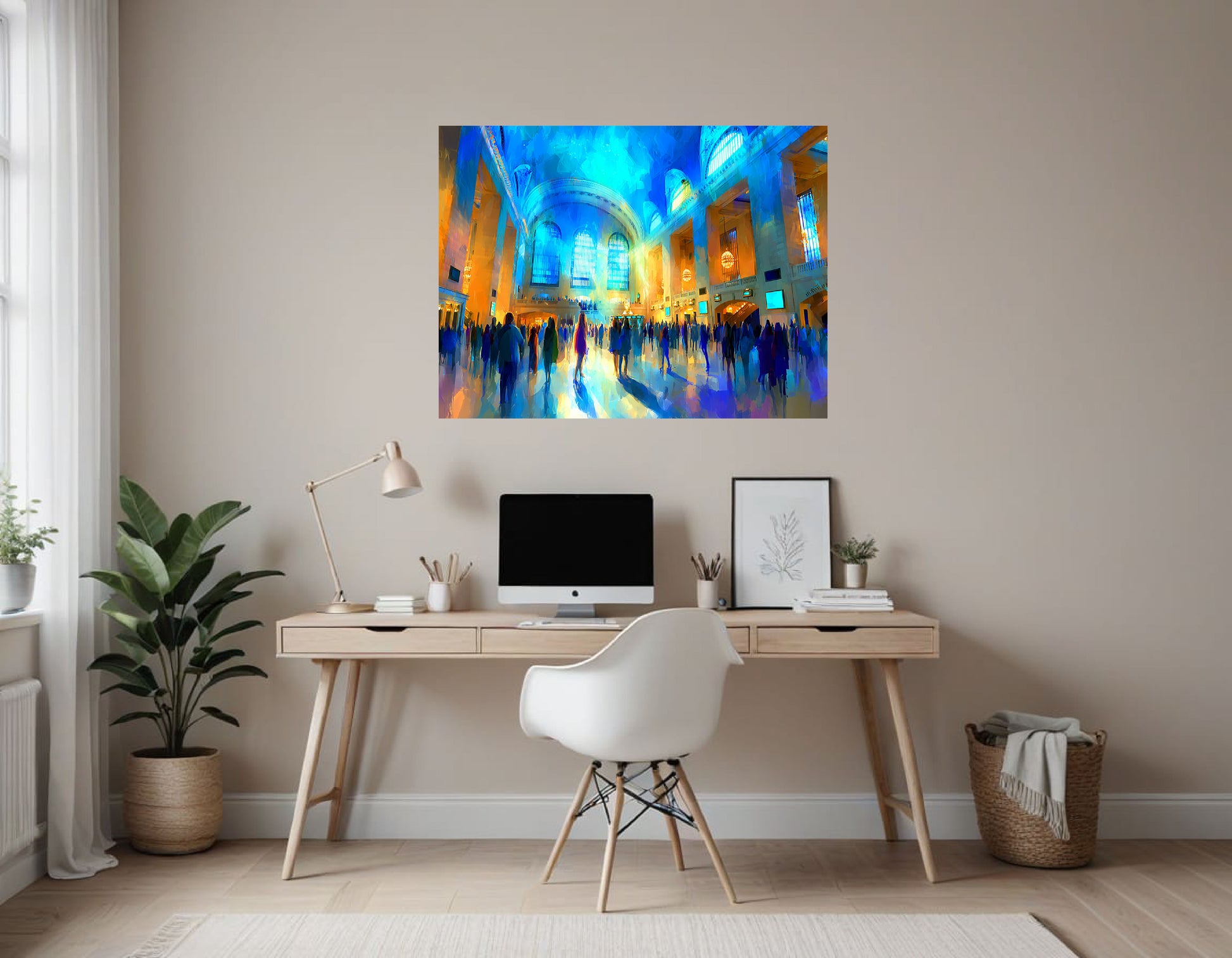 This digital painting portrays a vibrant and bustling scene inside a grand train station, New York City’s Grand Central Terminal. The artist uses expressive, energetic brushstrokes and a vivid color palette dominated by cool blues and warm golds to capture the dramatic interplay of light and architecture.