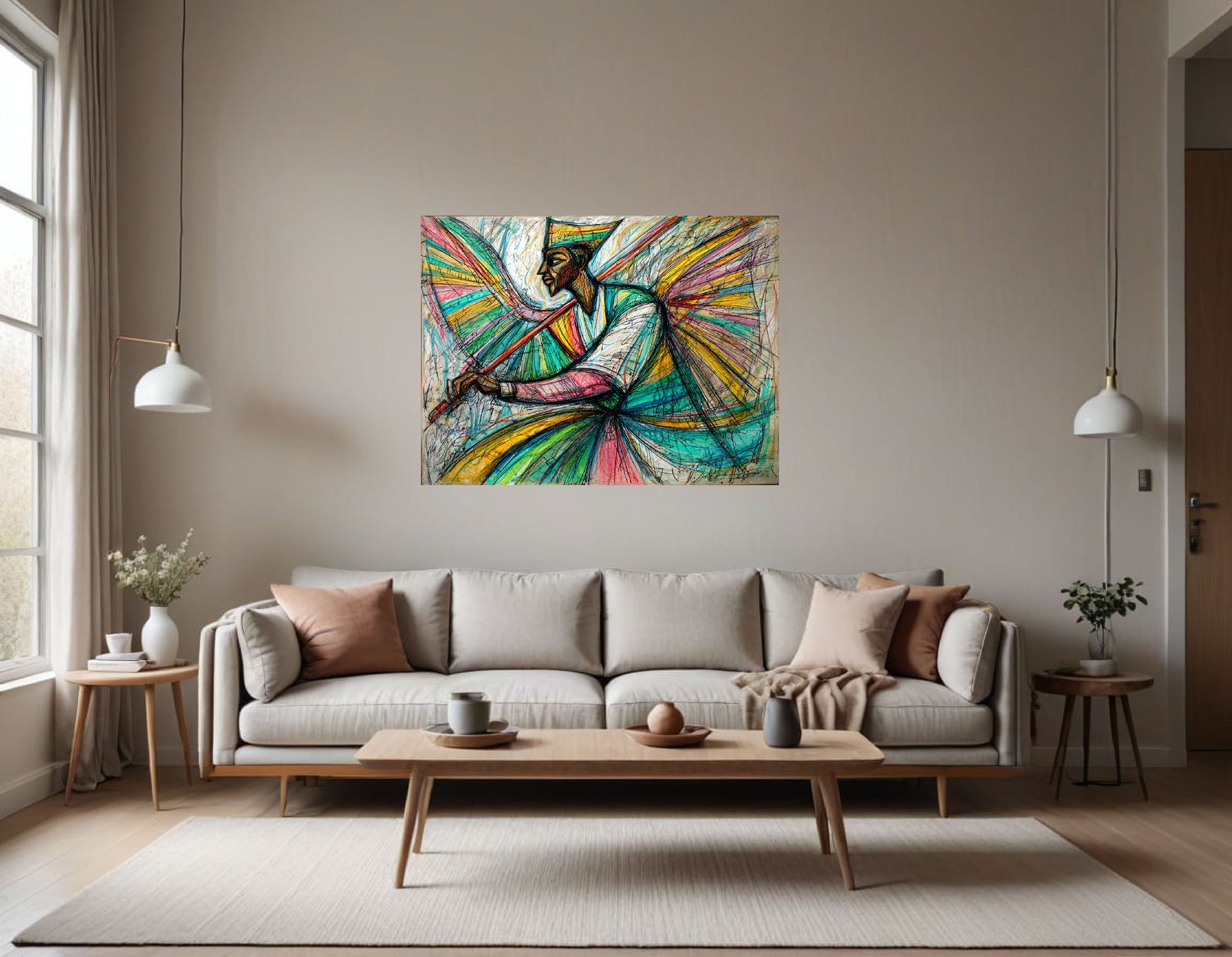The subject has dark skin and is depicted wearing a distinctive hat with horizontal stripes of yellow, green, and brown. They are holding a long, thin red object that extends across their body, suggesting it may be some kind of staff or musical instrument.