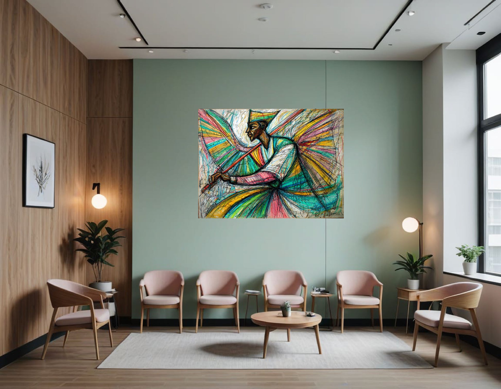 Behind the King, there is an abstract, colorful background reminiscent of wings accounting for the Ethiopian Angel. This is composed of segmented lines and geometric shapes in a spectrum of colors including yellows, pinks, blues, and greens. These colors are applied with a wax-like texture.