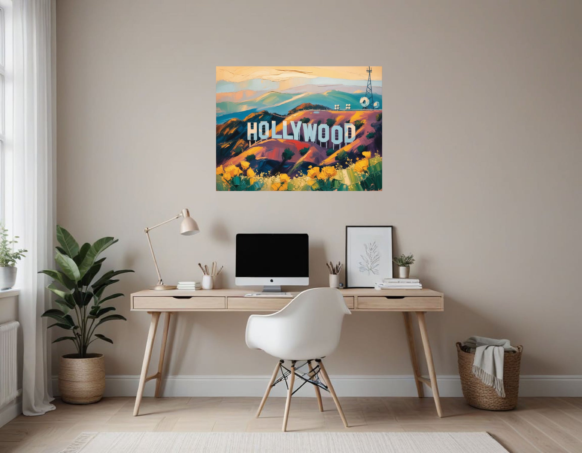 This is a vibrant, stylized digital painting of the iconic Hollywood sign, set against a picturesque backdrop of rolling hills and a serene sky. The artwork employs a textured, impasto style with bold, expressive brushstrokes that add depth and movement to the scene.
