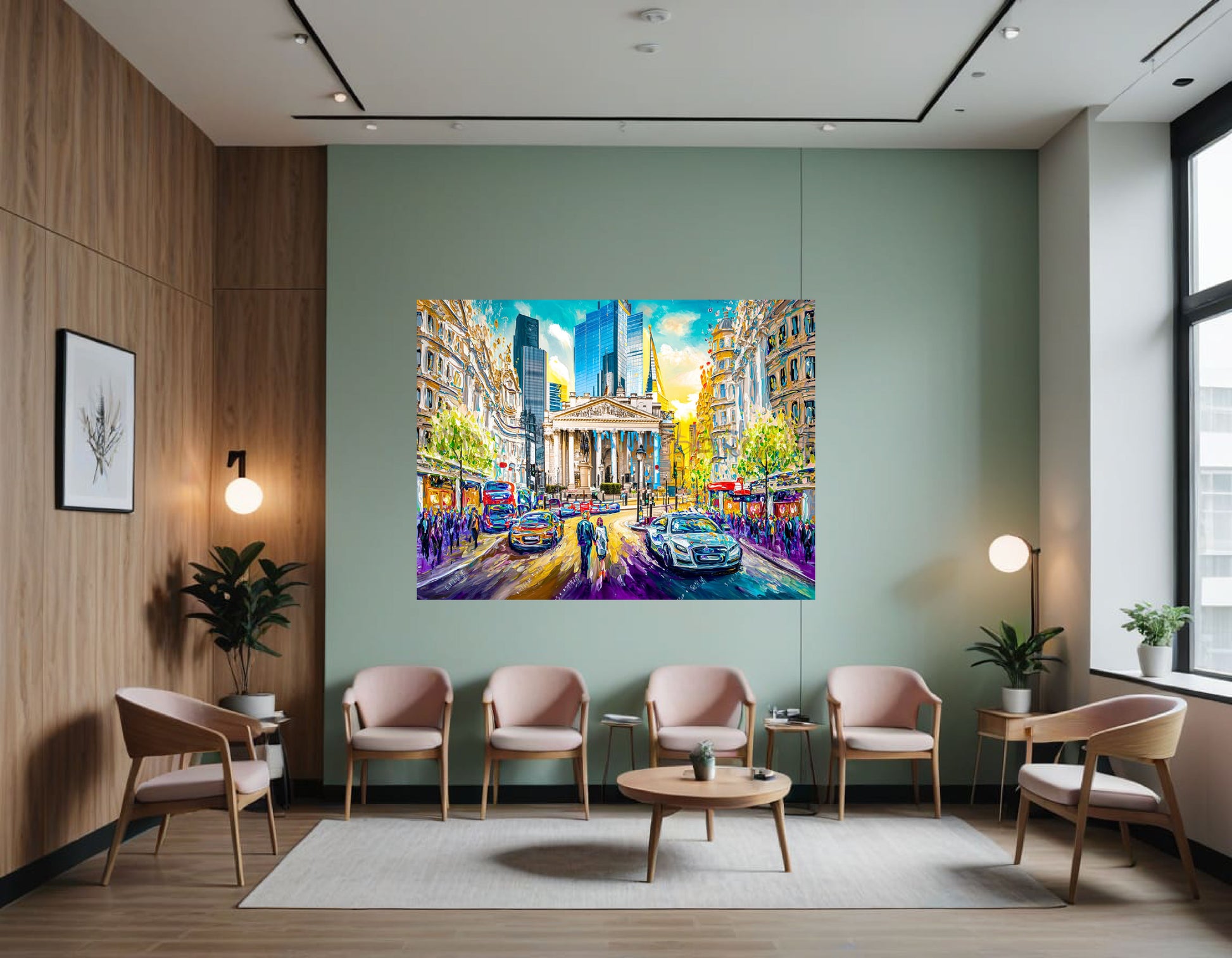 This is a vibrant and energetic cityscape digital painting, likely depicting a street in London. The artwork uses a bold impasto technique with thick, textured brushstrokes and a bright, almost fauvist color palette.