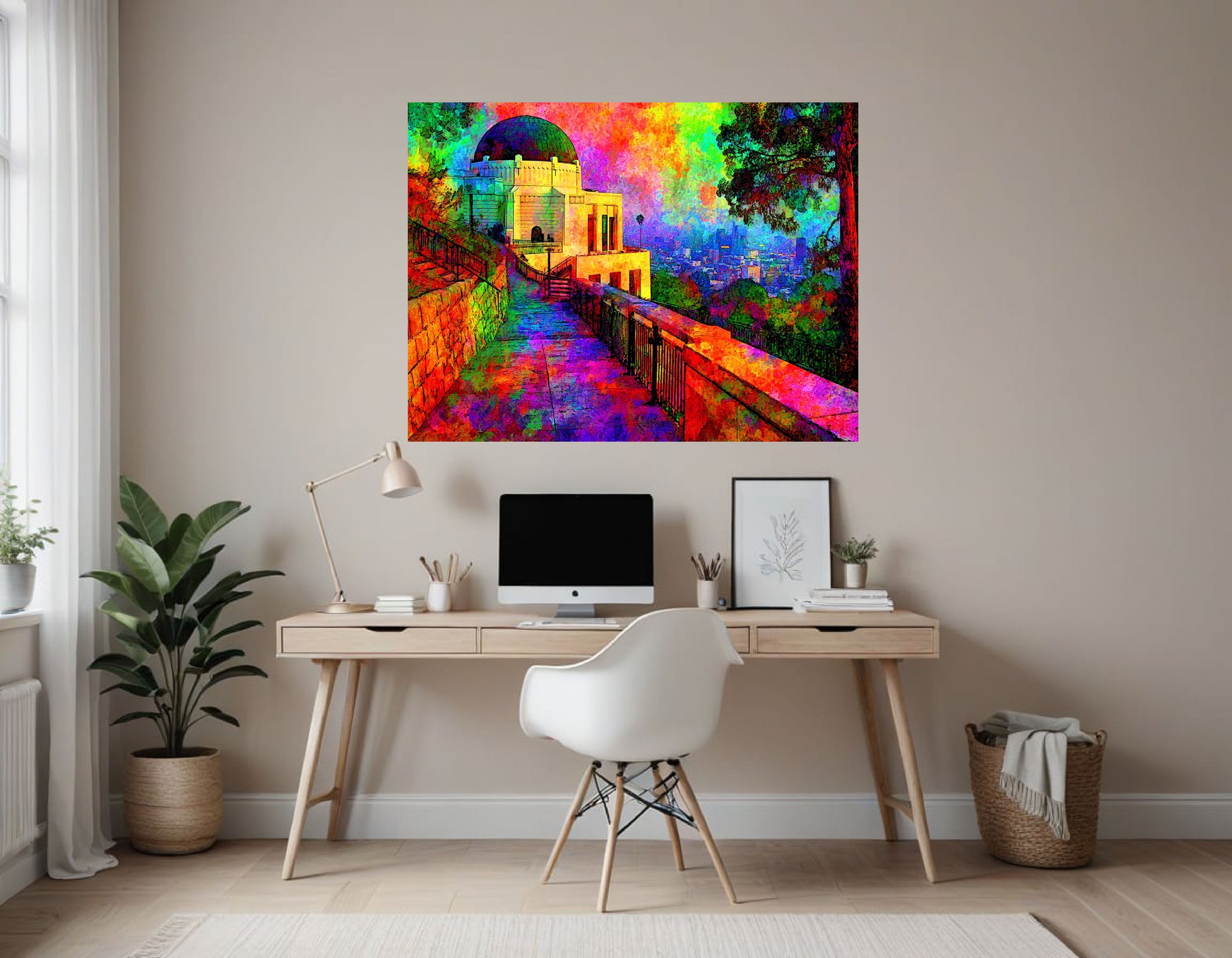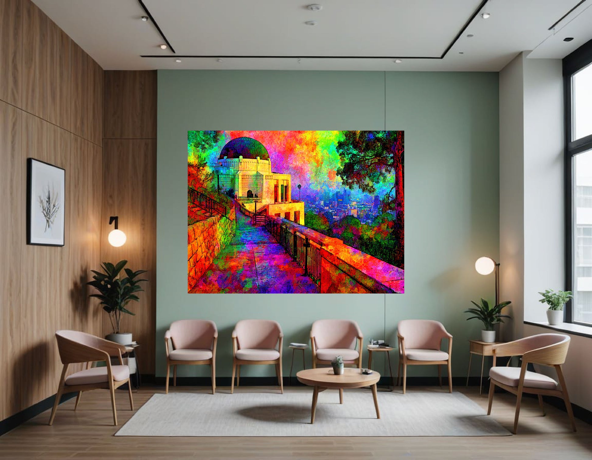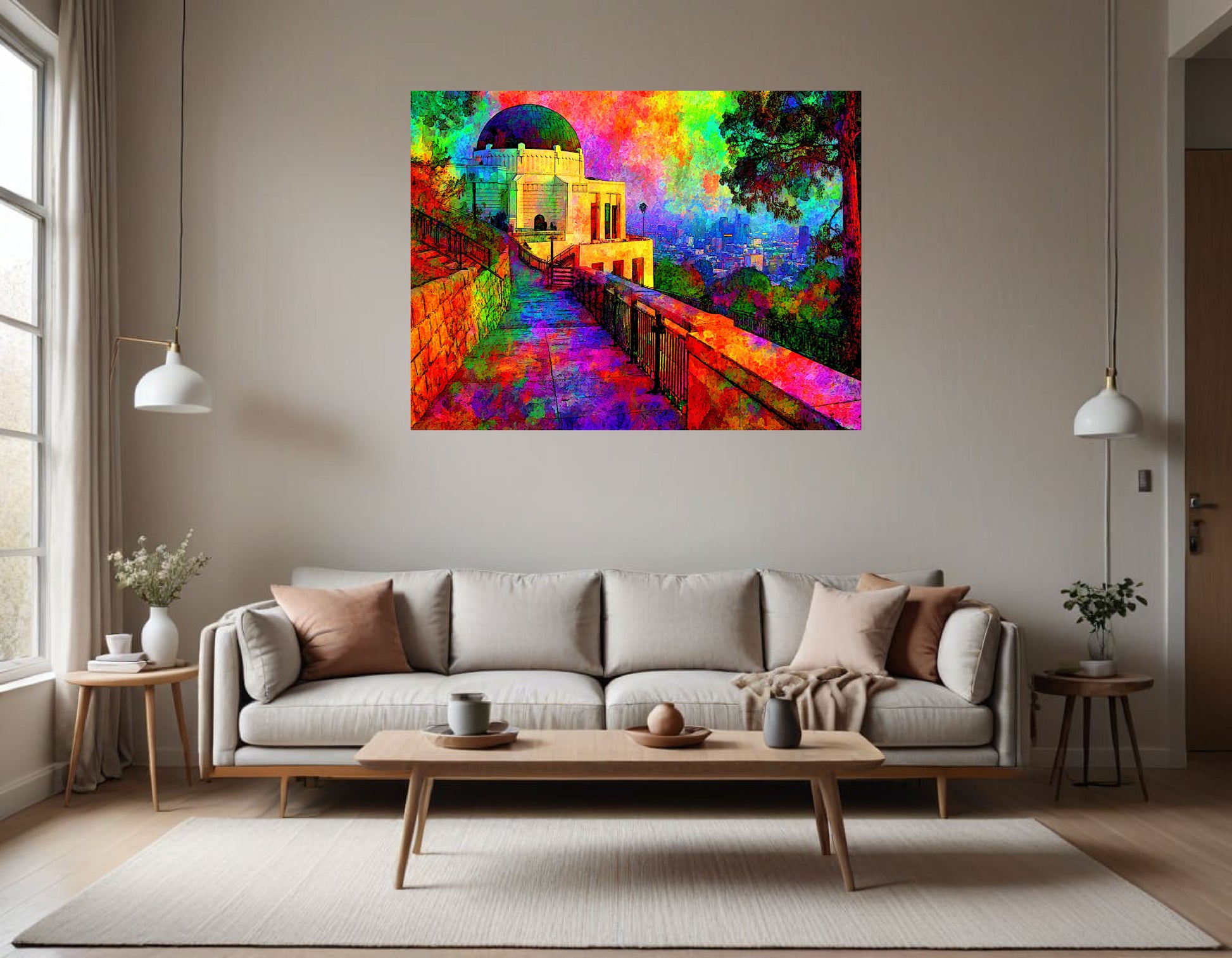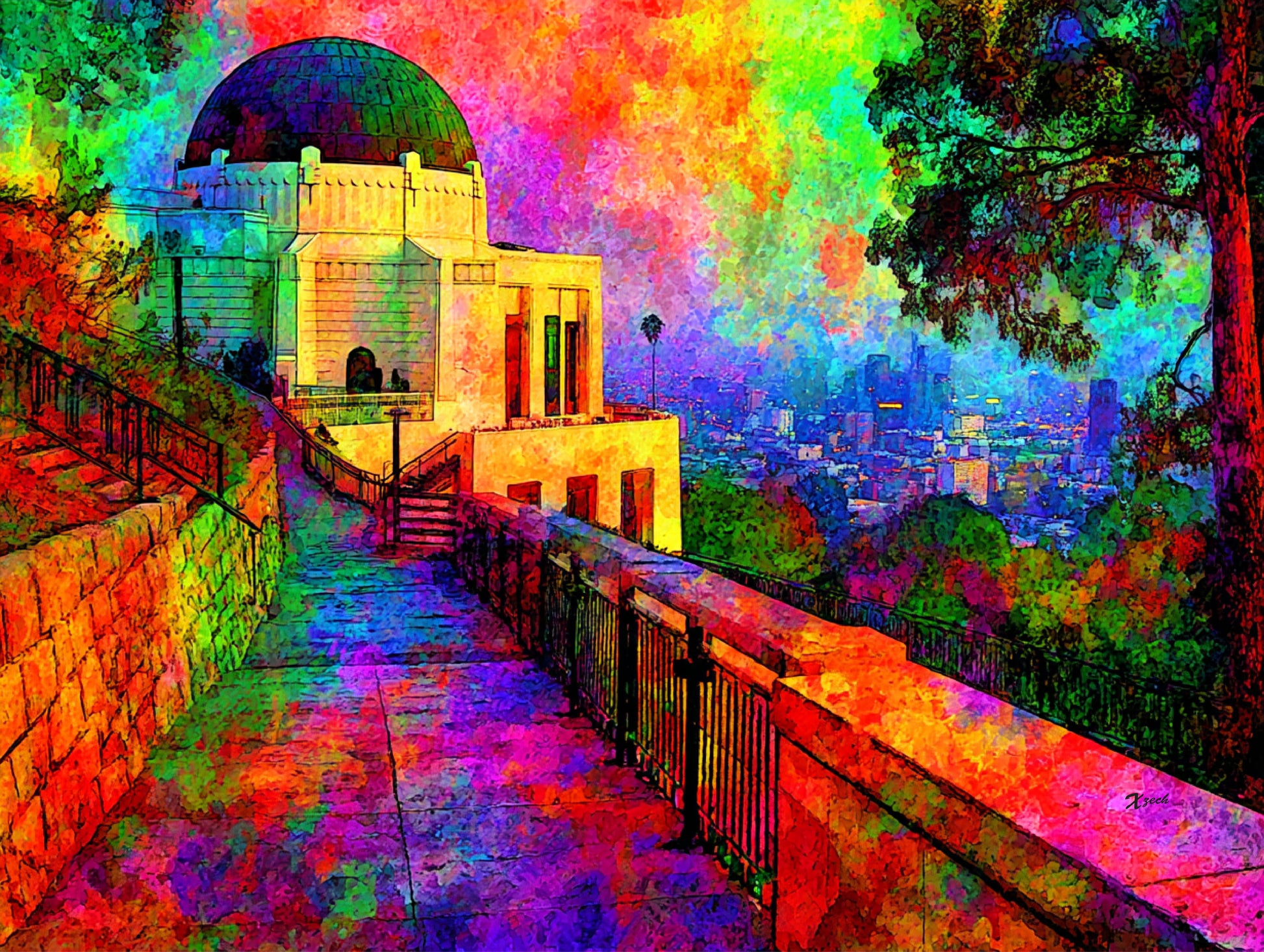 This painting is a striking, psychedelic vision of the Griffith Observatory overlooking Los Angeles. The scene is instantly captivating due to its intense, kaleidoscopic use of color. The observatory itself, with its recognizable domed roof and clean architectural lines, anchors the left side of the composition. The pathway leading up to it sweeps through the foreground, rendered in vibrant blues, purples, and magentas that almost pulse with energy.