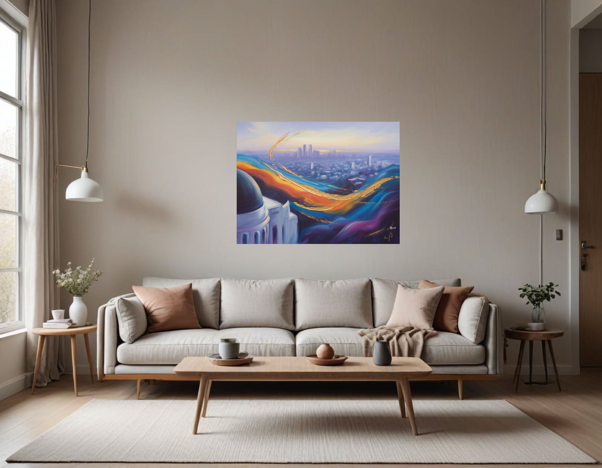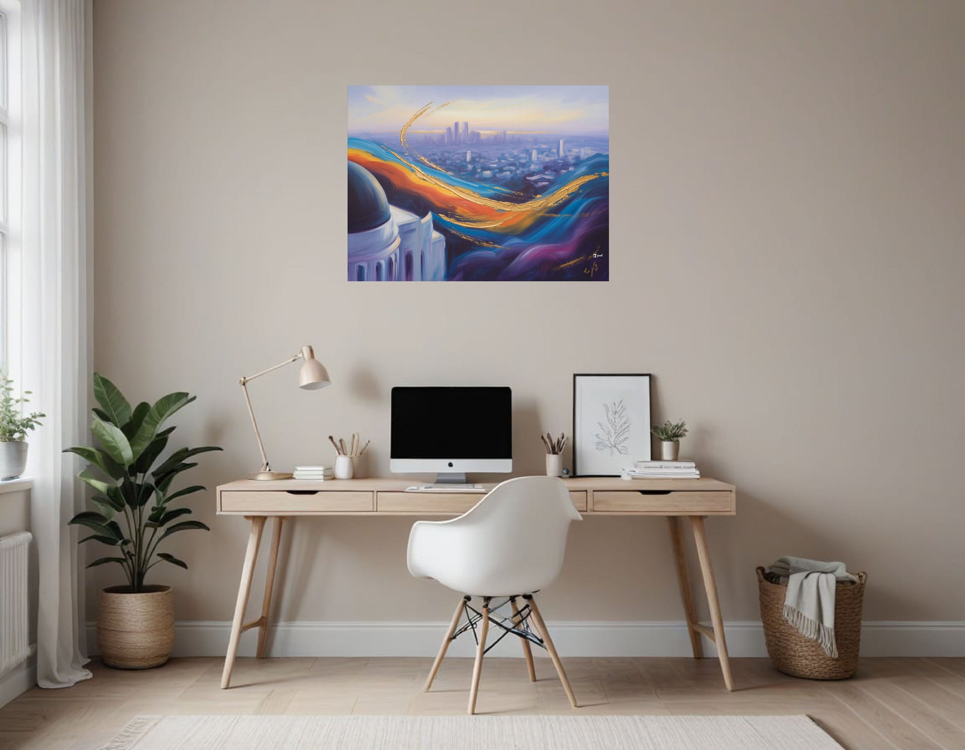 This painting features a stylized and colorful view of Los Angeles with the Griffith Observatory in the foreground and the downtown skyline in the distance. The painting employs a somewhat surreal color palette and expressive brushstrokes.