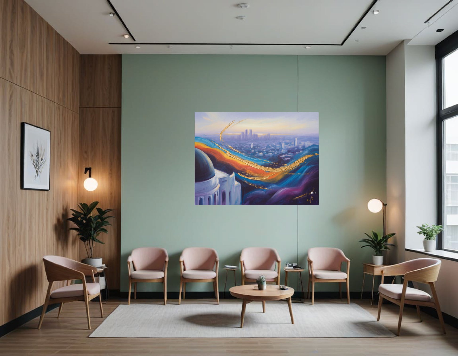 Overall, the painting offers a dreamy and imaginative interpretation of the Los Angeles landscape, blending iconic landmarks with a vibrant and expressive use of color and texture.