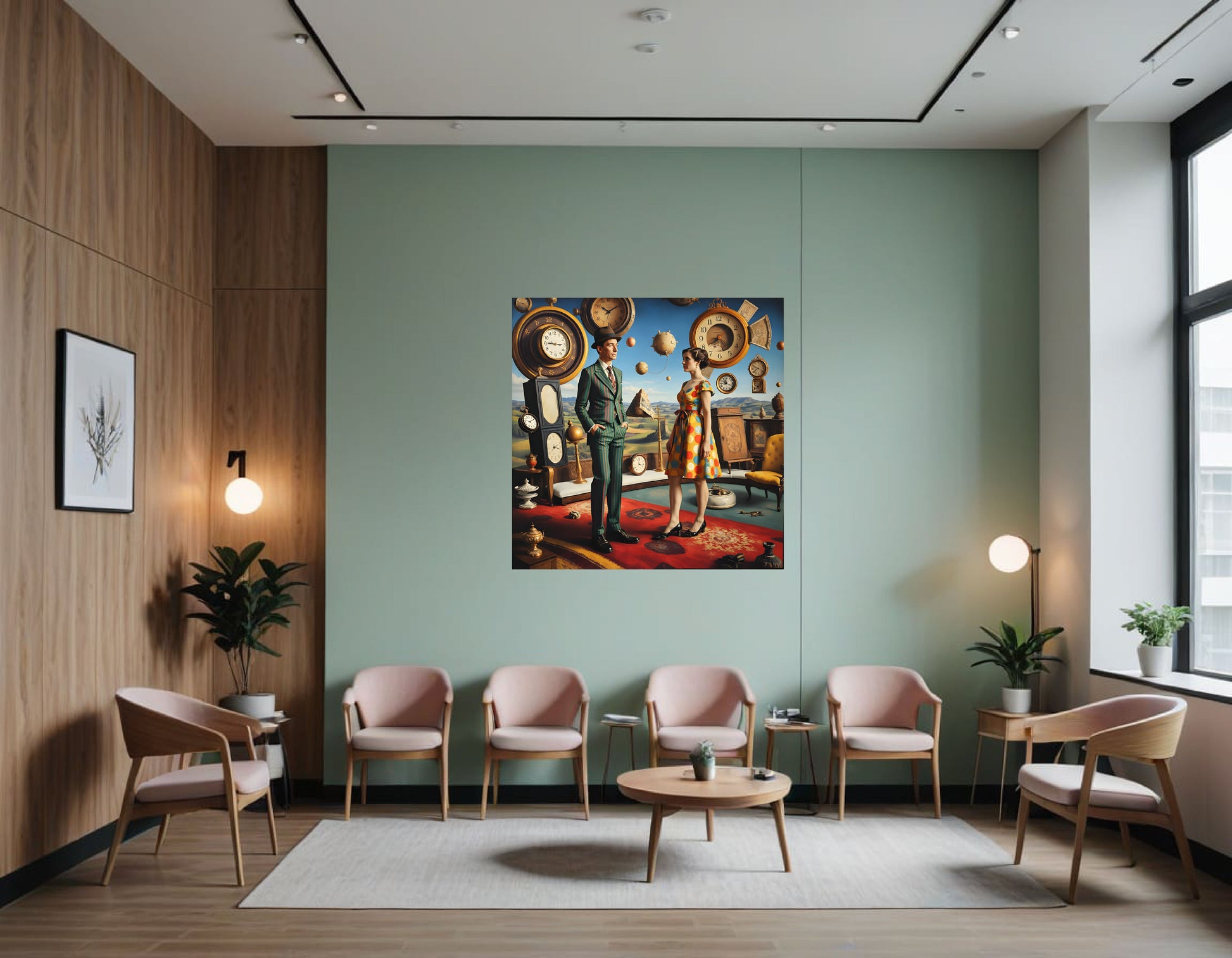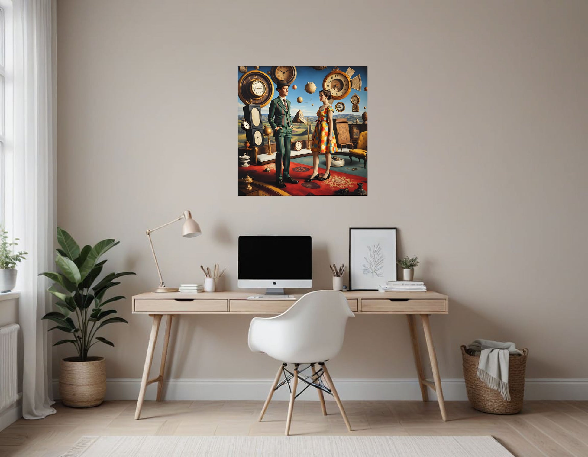 Surreal Elements: Clocks floating in the air, a distorted perspective, and the juxtaposition of different eras and styles contribute to the surreal atmosphere. The overall scene feels dreamlike and fantastical.
