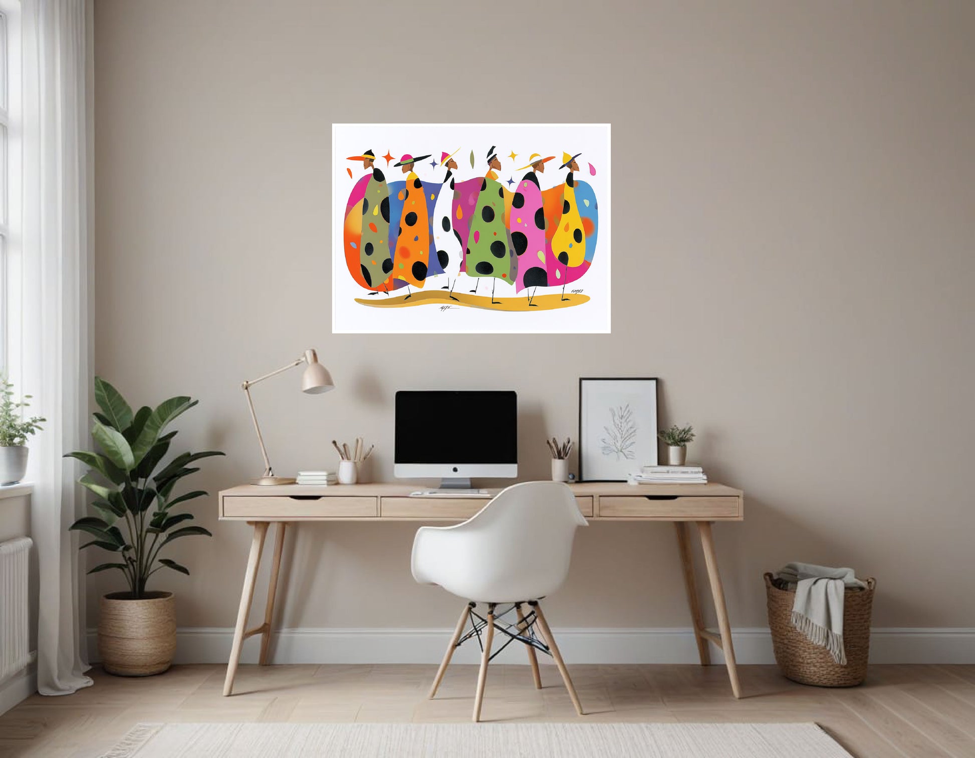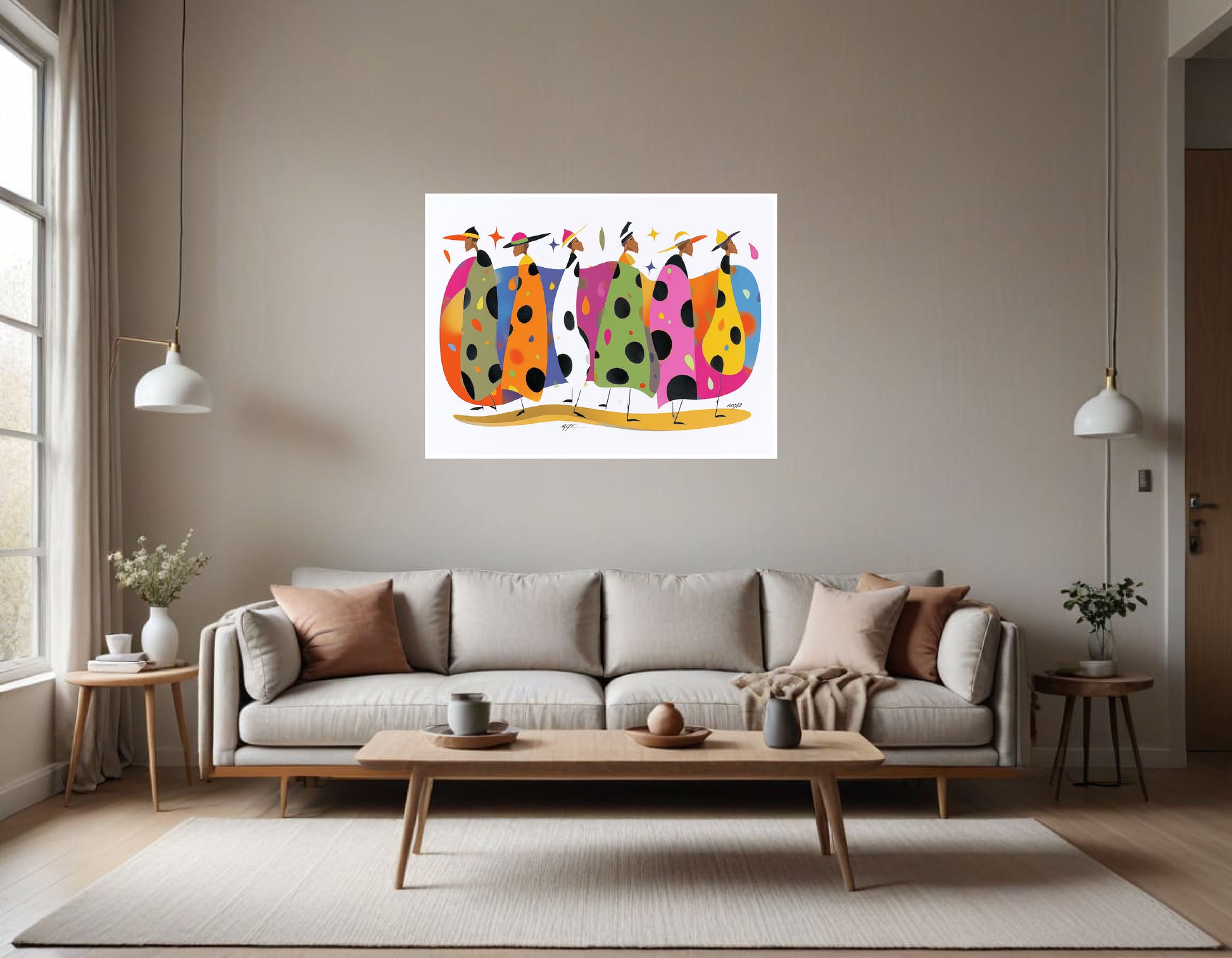 Each man wears a wide-brimmed hat and an oversized coat decorated with large polka dots. The coats are highly colorful and varied—mustard yellow, lavender, teal, pink, black, and light blue—each paired with contrasting trousers and shoes. The color palette is bold and playful, with strong contrasts and a deliberate lack of symmetry from figure to figure. The trousers are narrow and cropped, and the shoes are minimalist, reinforcing the graphic, fashion-forward aesthetic.