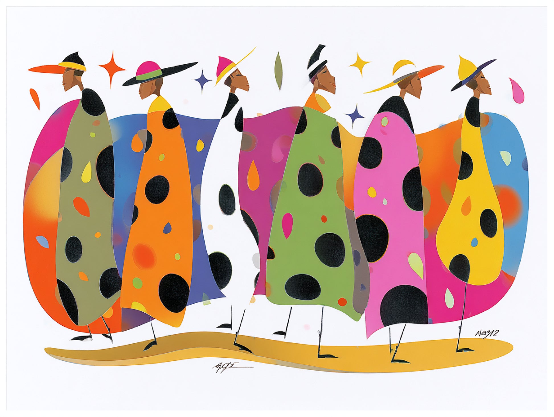 The background is stark white, which isolates the figures and draws attention to their silhouettes and colors. A subtle band of reflected color beneath their feet suggests a ground plane without defining a specific environment. Overall, the image conveys a sense of rhythm, individuality within uniformity, and a whimsical, modern approach to fashion illustration or figurative art.