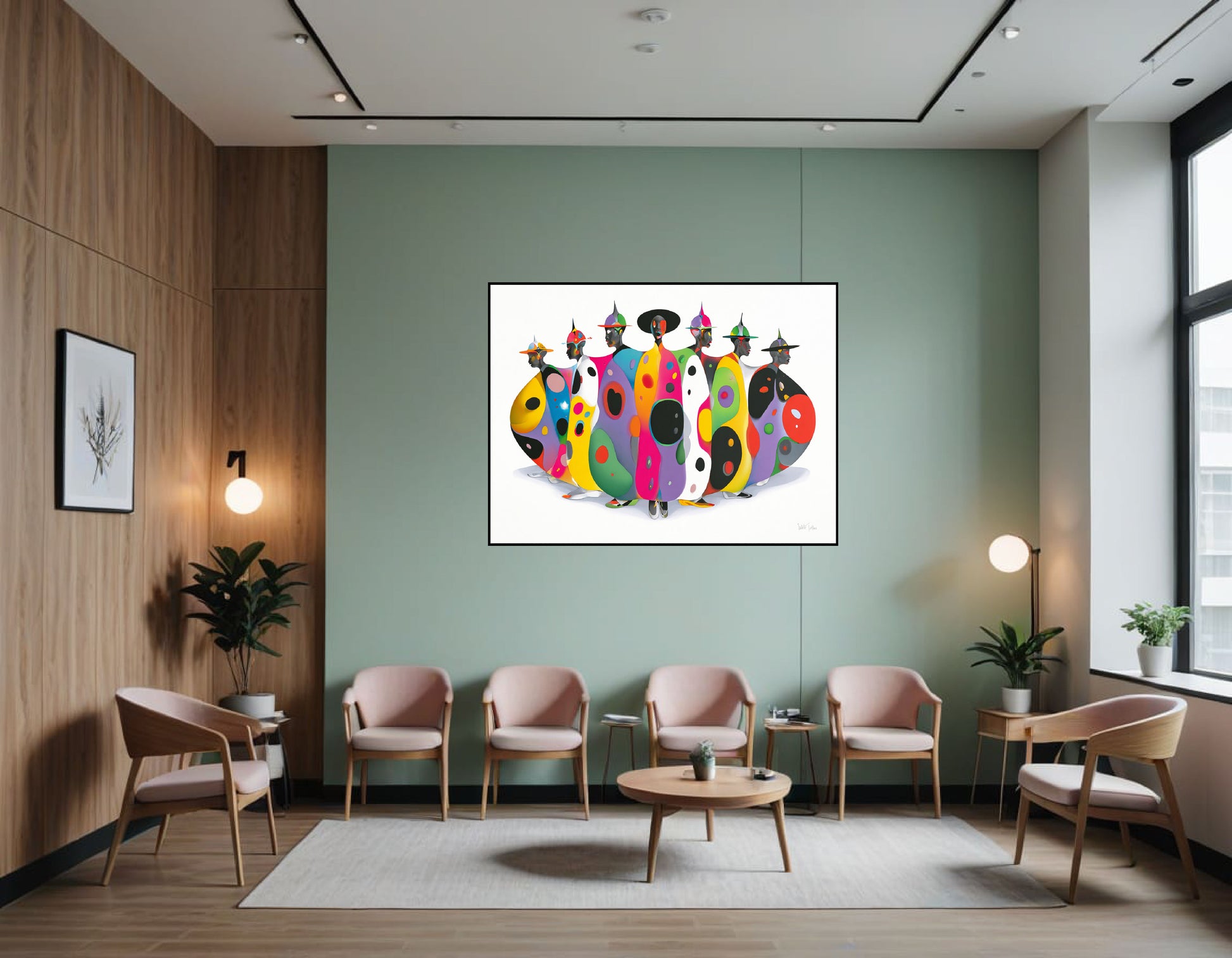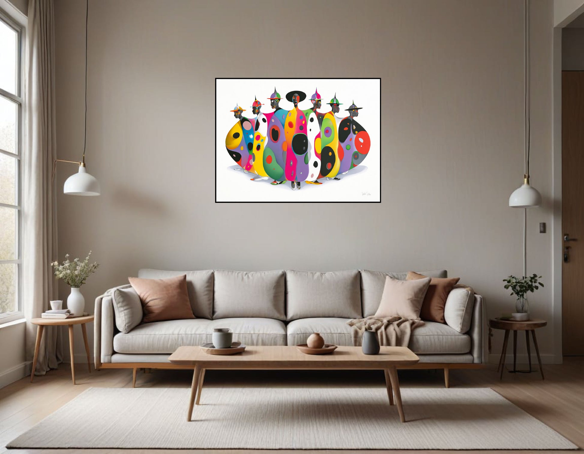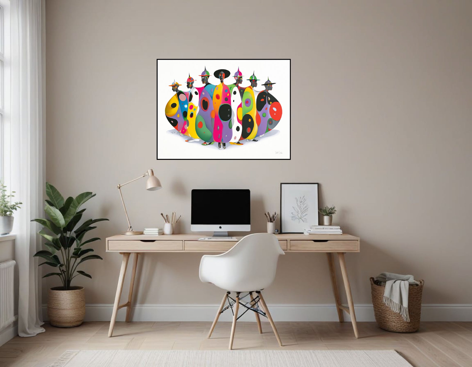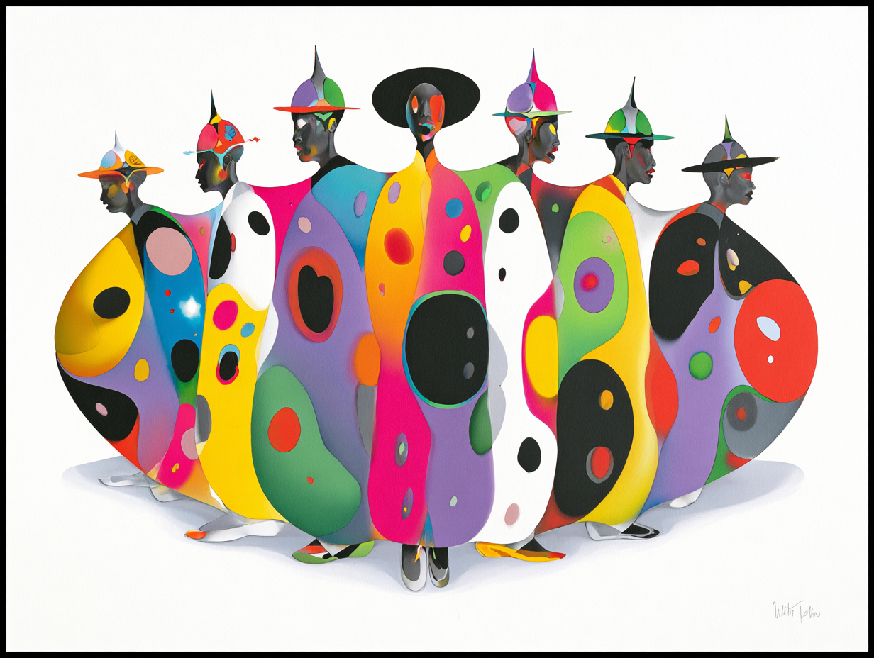Each figure wears a wide-brimmed or pointed hat, and their faces are simplified, dark-toned, and mask-like, shown mostly in profile or three-quarter view. The bodies are covered in bold, abstract patterns—large organic shapes, dots, and ovals—rendered in vivid colors like yellow, pink, turquoise, green, purple, red, black, and white. The patterns vary from figure to figure, creating individuality while maintaining a cohesive visual rhythm.