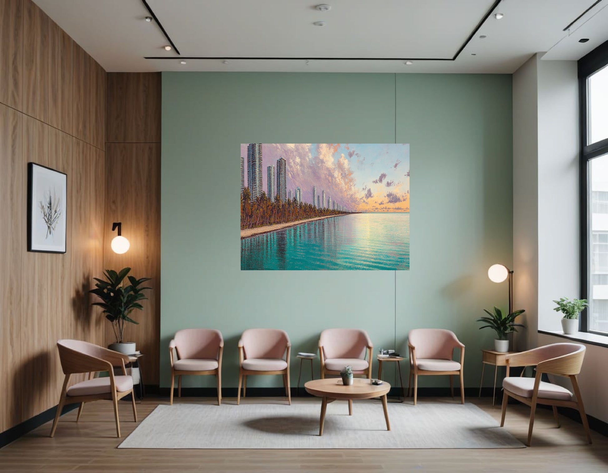 The digital painting depicts a coastal cityscape of Miami at dawn or dusk, rendered in a textured, impressionistic style. Tall, modern skyscrapers dominate the left side of the composition, their vertical lines stark against the soft hues of the sky. A line of trees runs along the shore, their foliage depicted with warm browns and greens. The sky transitions from a pale blue to a warm orange and pink as it meets the horizon, with puffy clouds adding depth and texture. The water is a serene turquoise, reflecting the colors of the sky and subtly mirroring the city skyline. The overall mood is tranquil and serene, capturing the beauty of a coastal city at a peaceful moment in time. The thick application of paint and visible brushstrokes create a sense of movement and vibrancy throughout the scene.