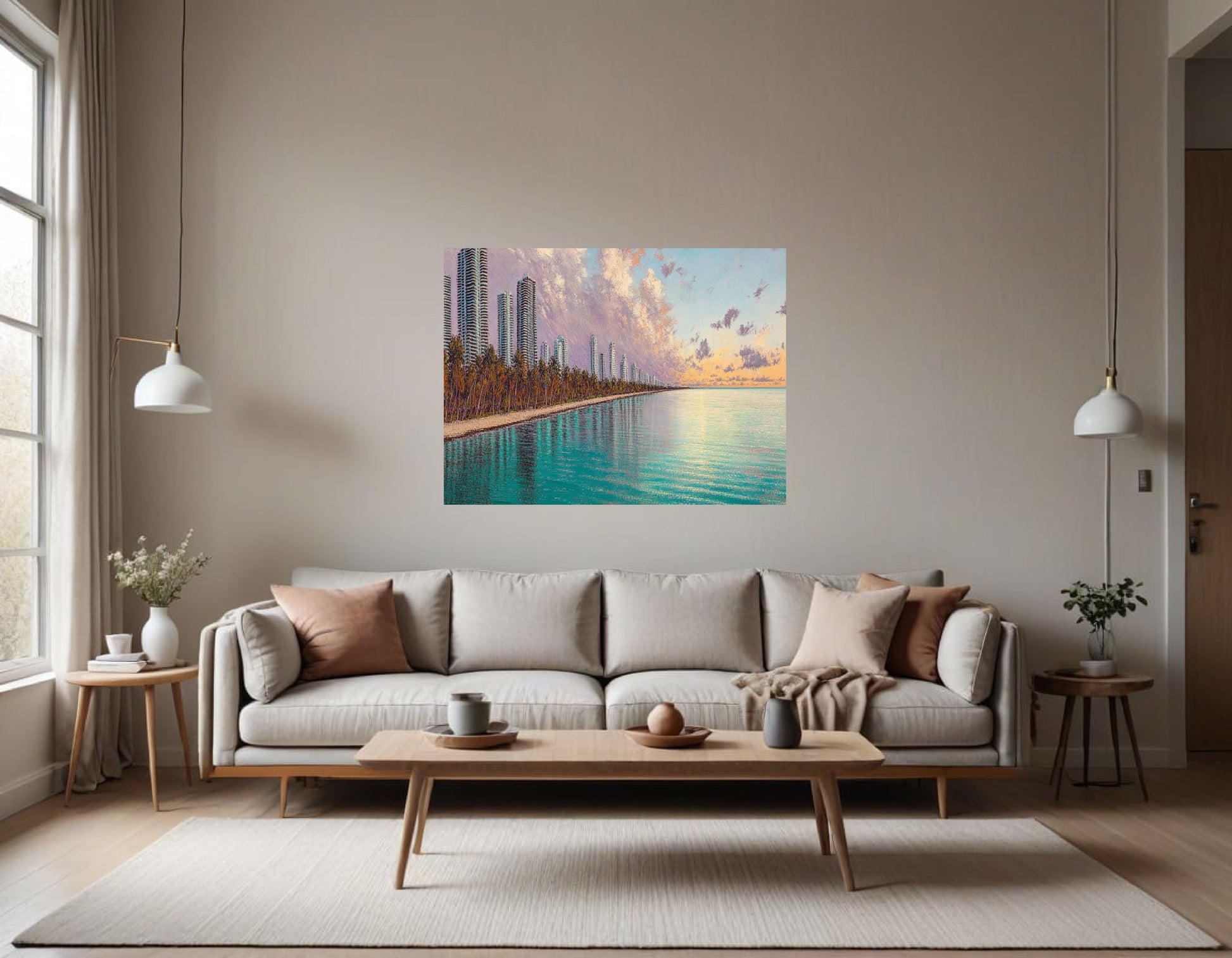 The painting depicts a coastal cityscape of Miami at dawn or dusk, rendered in a textured, impressionistic style. Tall, modern skyscrapers dominate the left side of the composition, their vertical lines stark against the soft hues of the sky. A line of trees runs along the shore, their foliage depicted with warm browns and greens. The sky transitions from a pale blue to a warm orange and pink as it meets the horizon, with puffy clouds adding depth and texture. The water is a serene turquoise, reflecting the colors of the sky and subtly mirroring the city skyline. The overall mood is tranquil and serene, capturing the beauty of a coastal city at a peaceful moment in time. The thick application of paint and visible brushstrokes create a sense of movement and vibrancy throughout the scene.