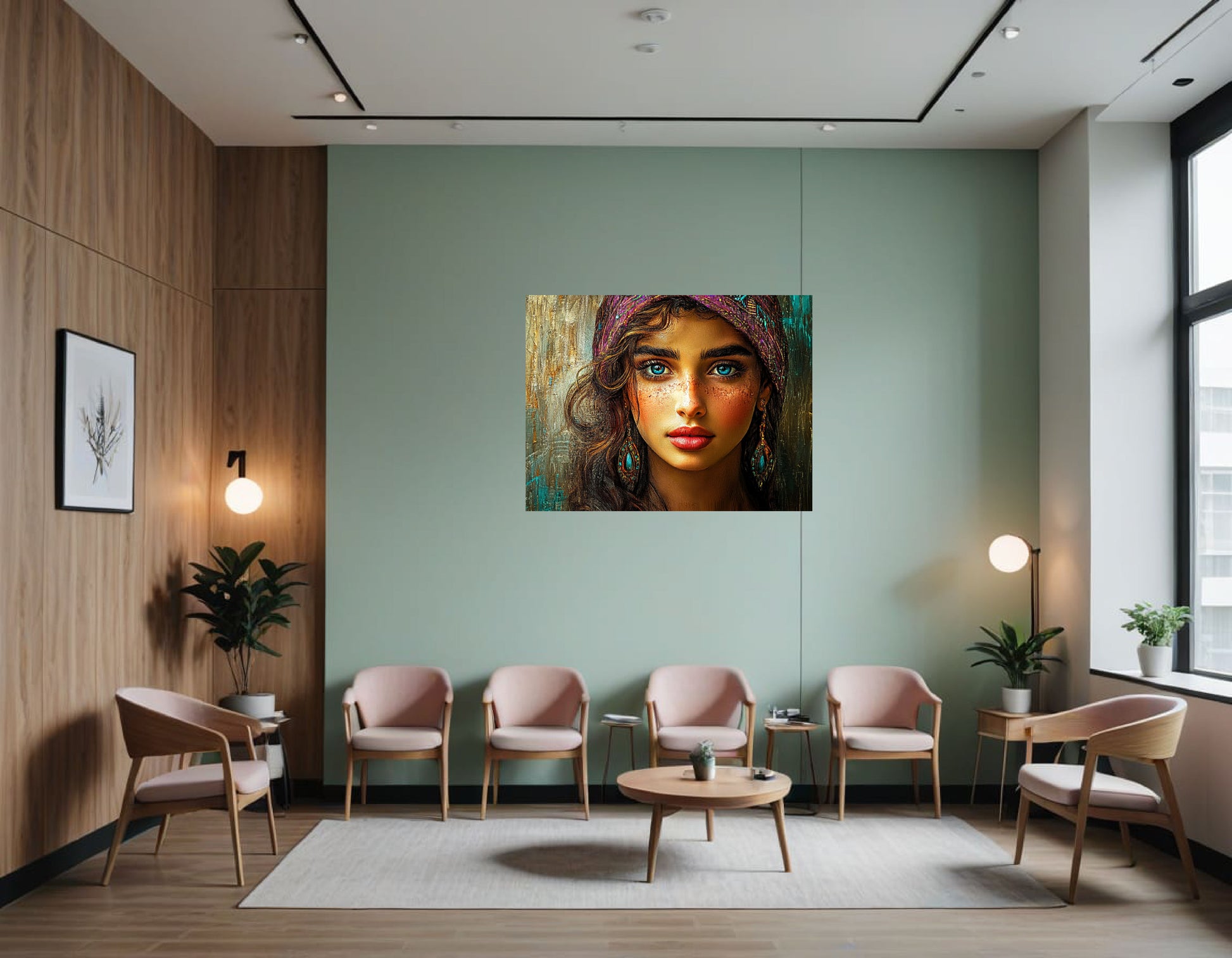 Her hair is long, wavy, and brown with golden undertones, flowing naturally over her shoulders. She is adorned with elegant, dangling earrings that incorporate gold elements and turquoise stones, complementing the colors in her headscarf and adding a touch of sophistication and cultural richness to the portrait. The overall effect is a captivating blend of realism and painterly abstraction, emphasizing texture, color, and ornamentation.