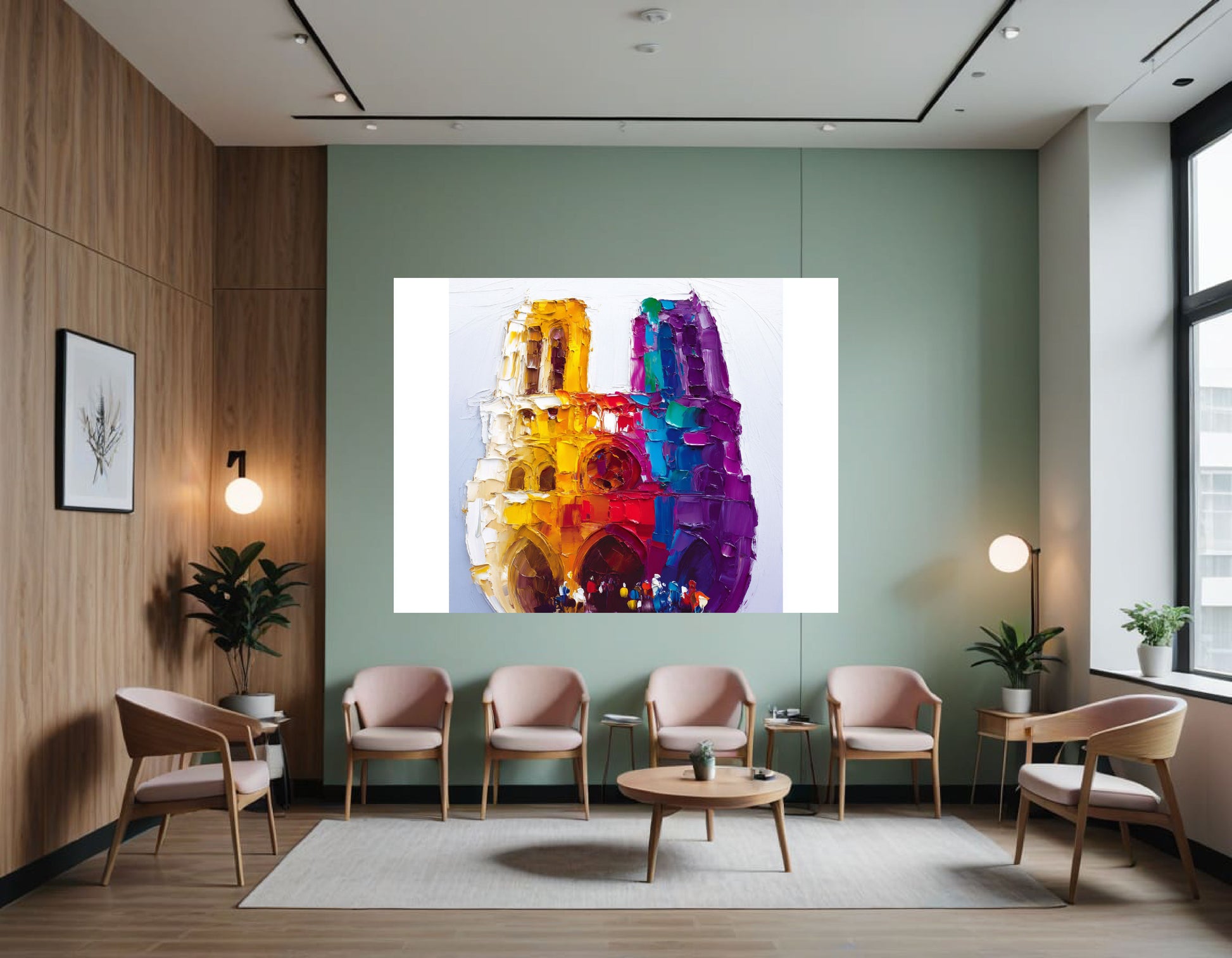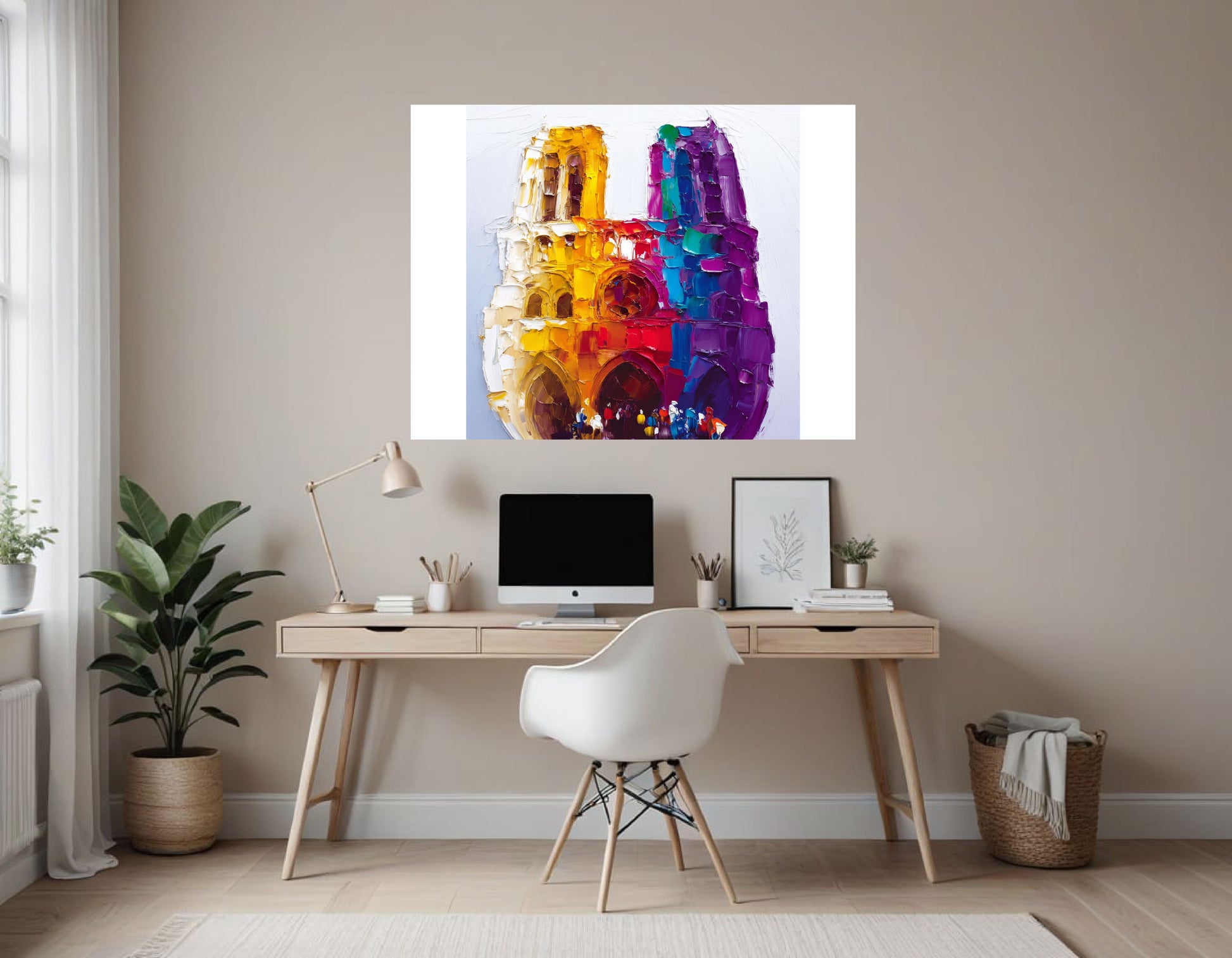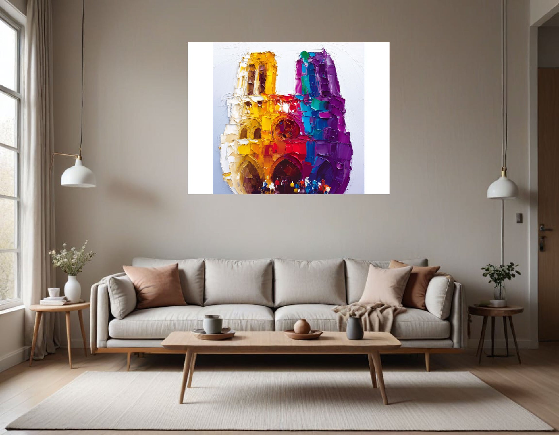 The painting is a vibrant and heavily textured impasto depiction of a cathedral, reminiscent of Notre Dame de Paris, though stylized with an unconventional color scheme. The artist uses thick brushstrokes and bold hues to create a dynamic and almost abstract representation of the iconic architecture.