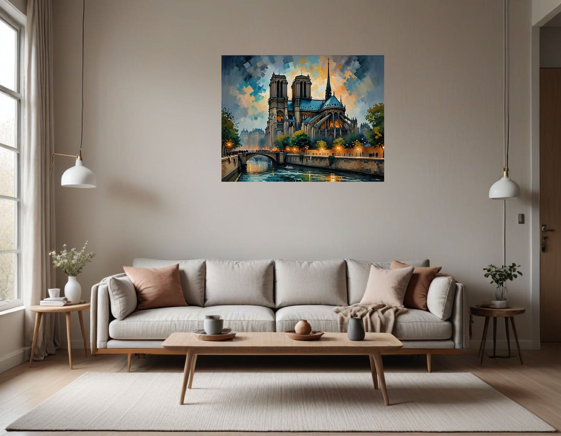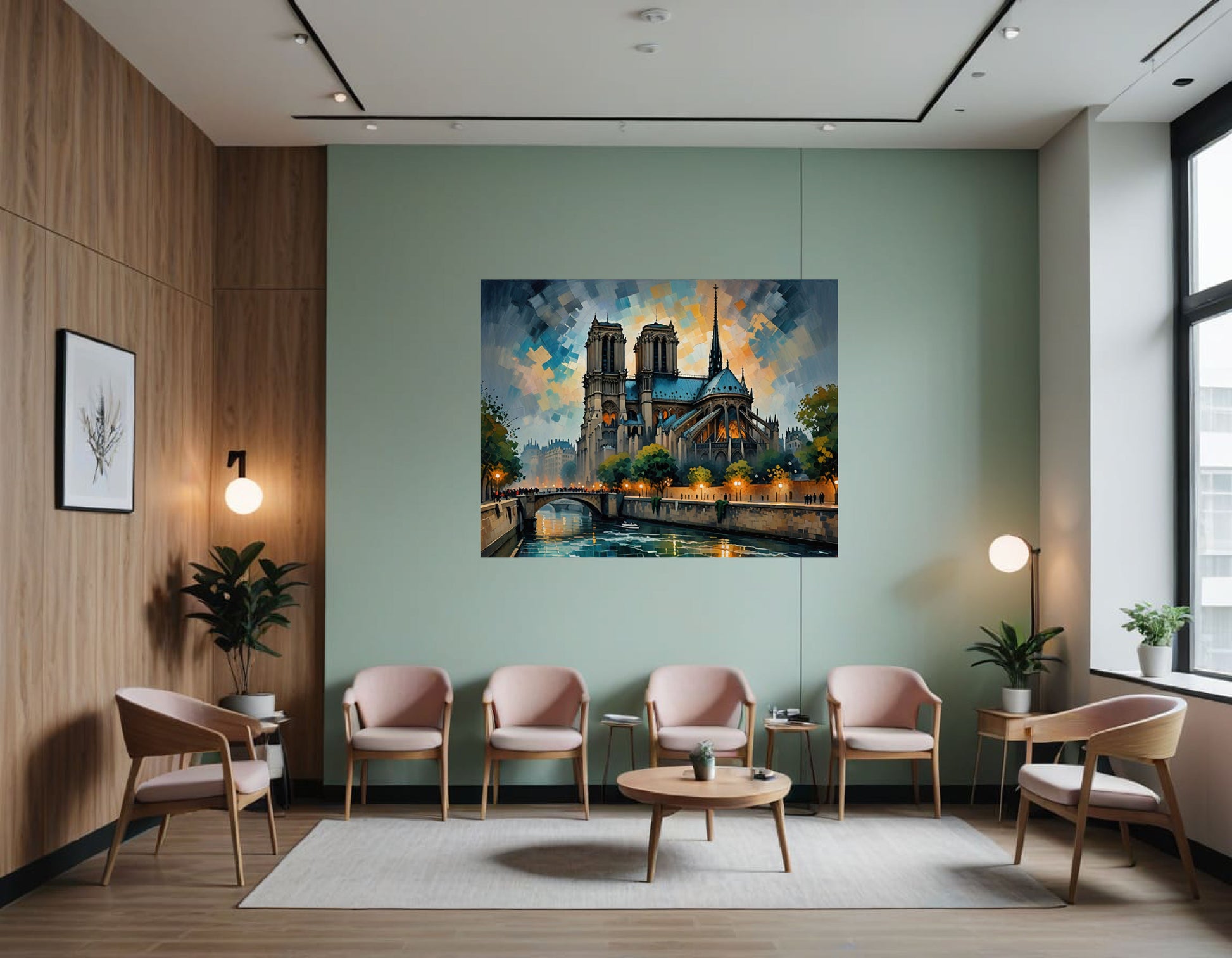 Beneath the cathedral, the Seine River flows gently, reflecting the lights and colors of the sky and the cathedral itself. A charming stone bridge crosses the river in the left foreground, bustling with small, dark figures that suggest the presence of locals and tourists alike. Along the riverbanks, glowing lamplights and lush green trees lend warmth and life to the scene. Buildings in the background recede in misty blue-gray tones, enhancing the sense of depth.