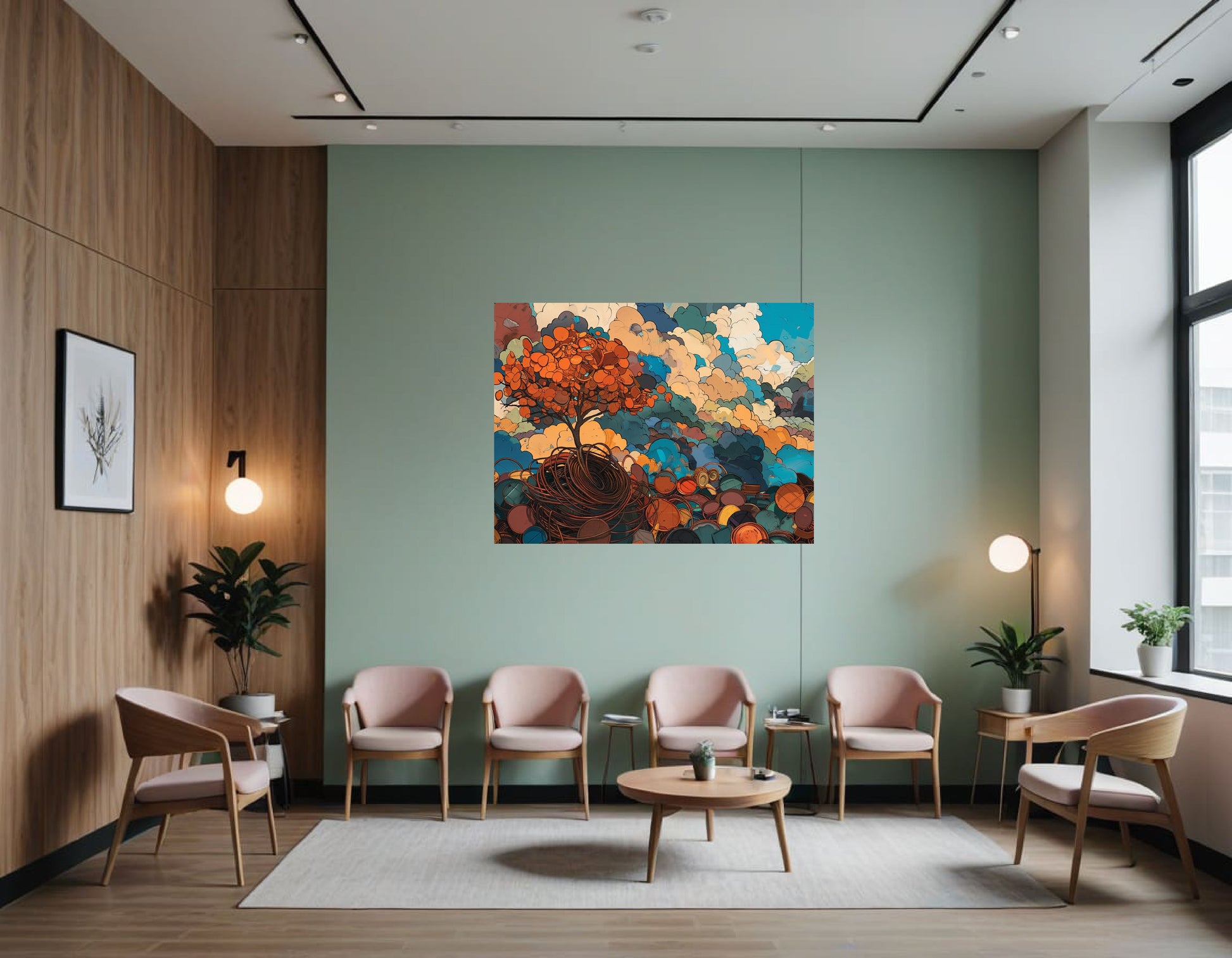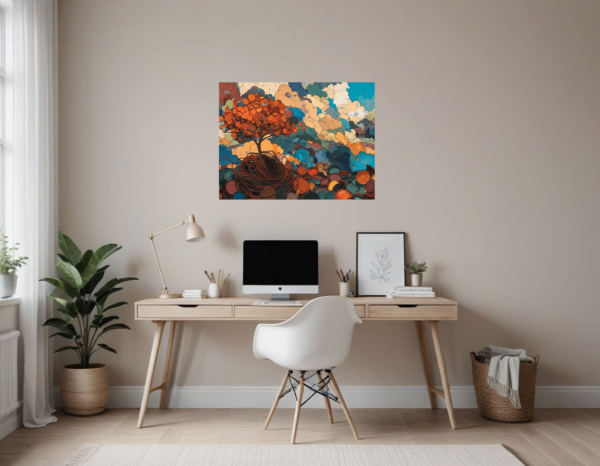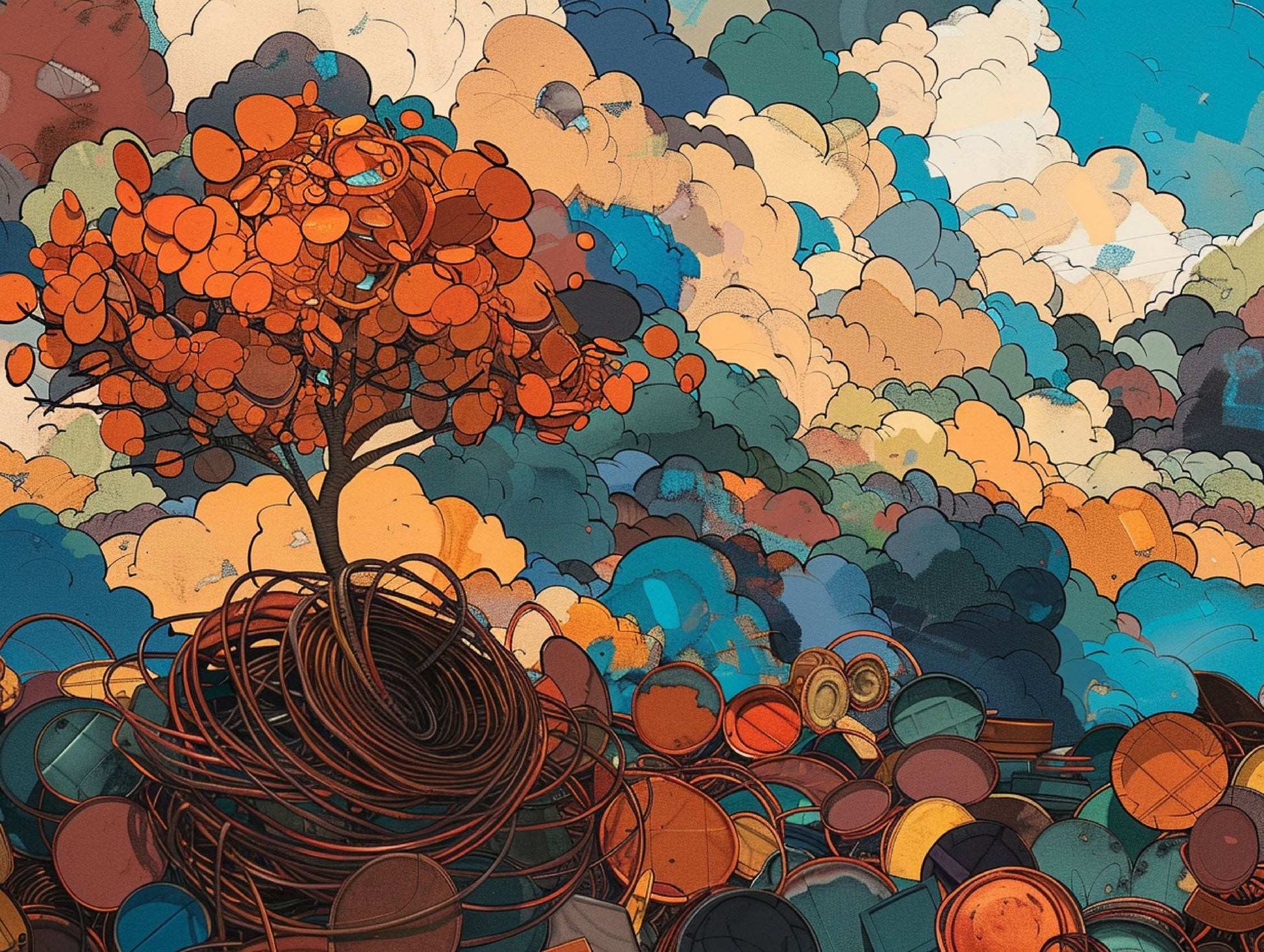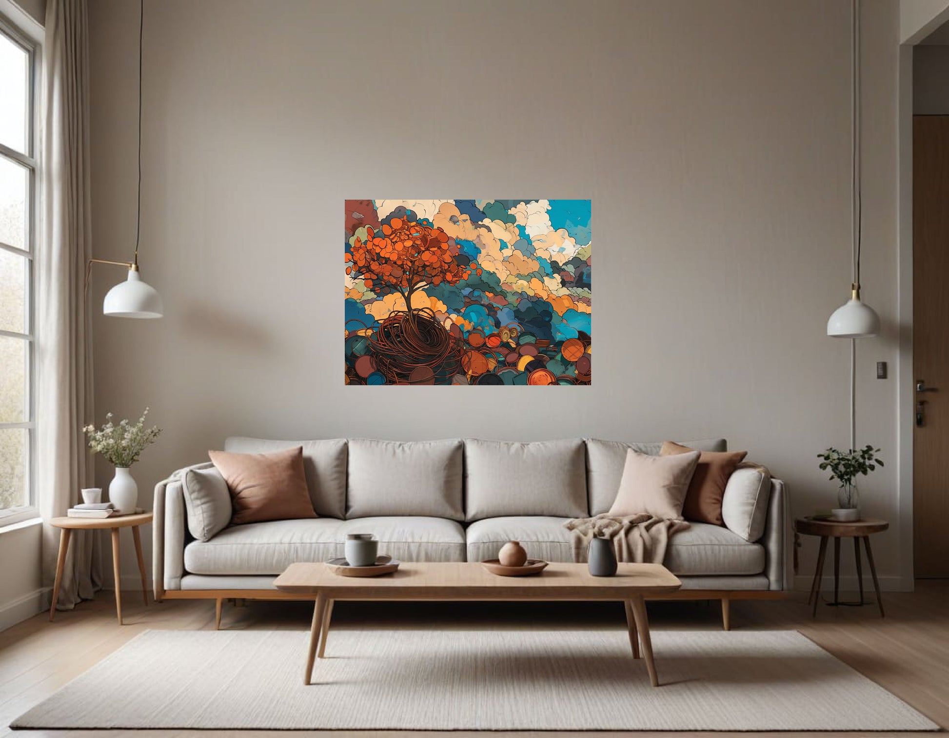 This digital painting is a rich and evocative composition that blends a symbolic interplay of nature and industrial elements. At its center is a dynamic tree with bright orange, circular leaves that stand out vividly against an intricately layered backdrop of soft, painterly clouds in shades of blue, beige, and peach. The tree’s trunk appears to emerge from a swirling base of tangled wires or coils, seamlessly connecting the organic and mechanical worlds.