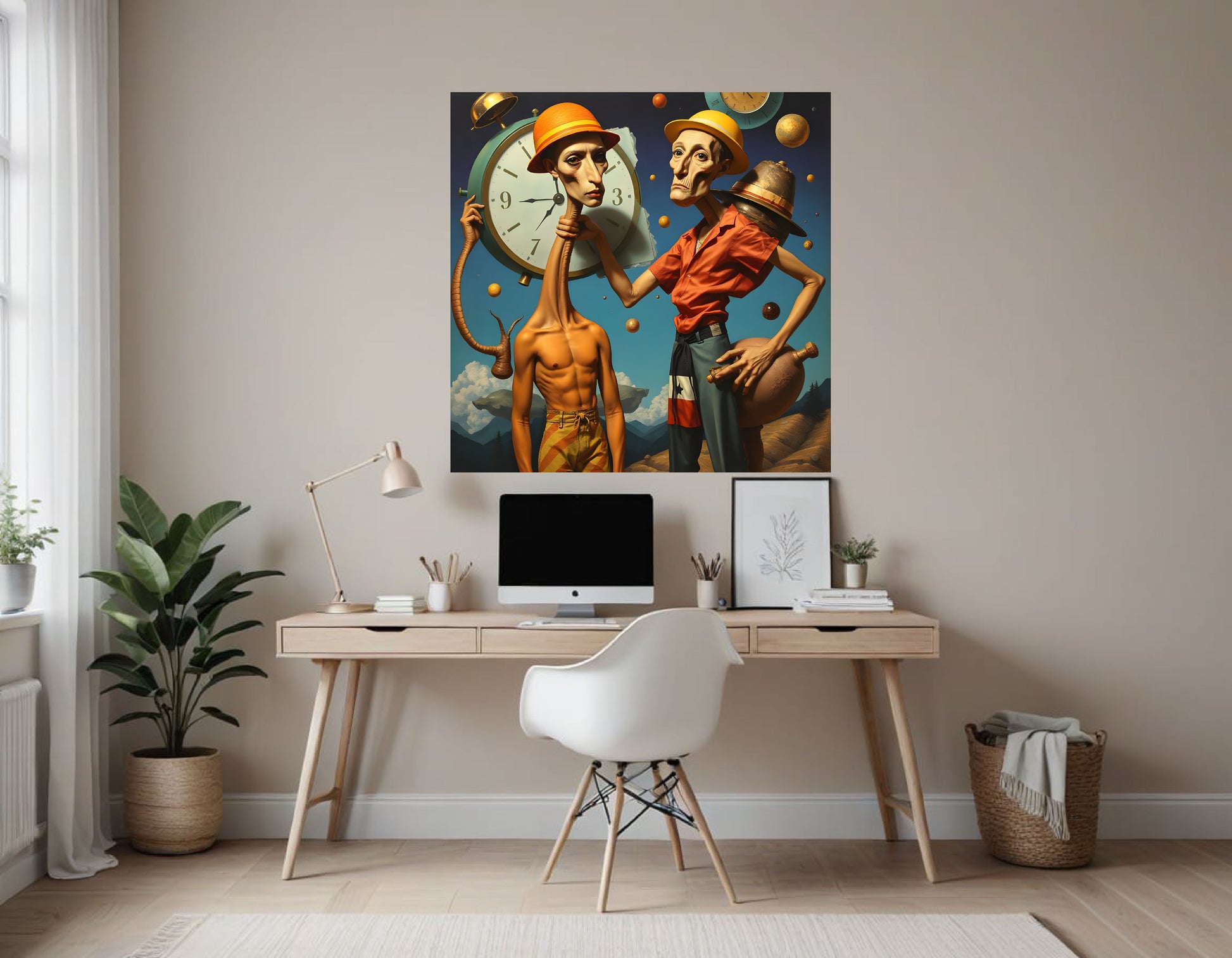 The Figures: Two elongated, strangely proportioned figures are the central focus. One figure has an extremely long neck and is holding a large alarm clock. The other figure is older-looking, and both wear hats. Their bodies are oddly colored and textured.