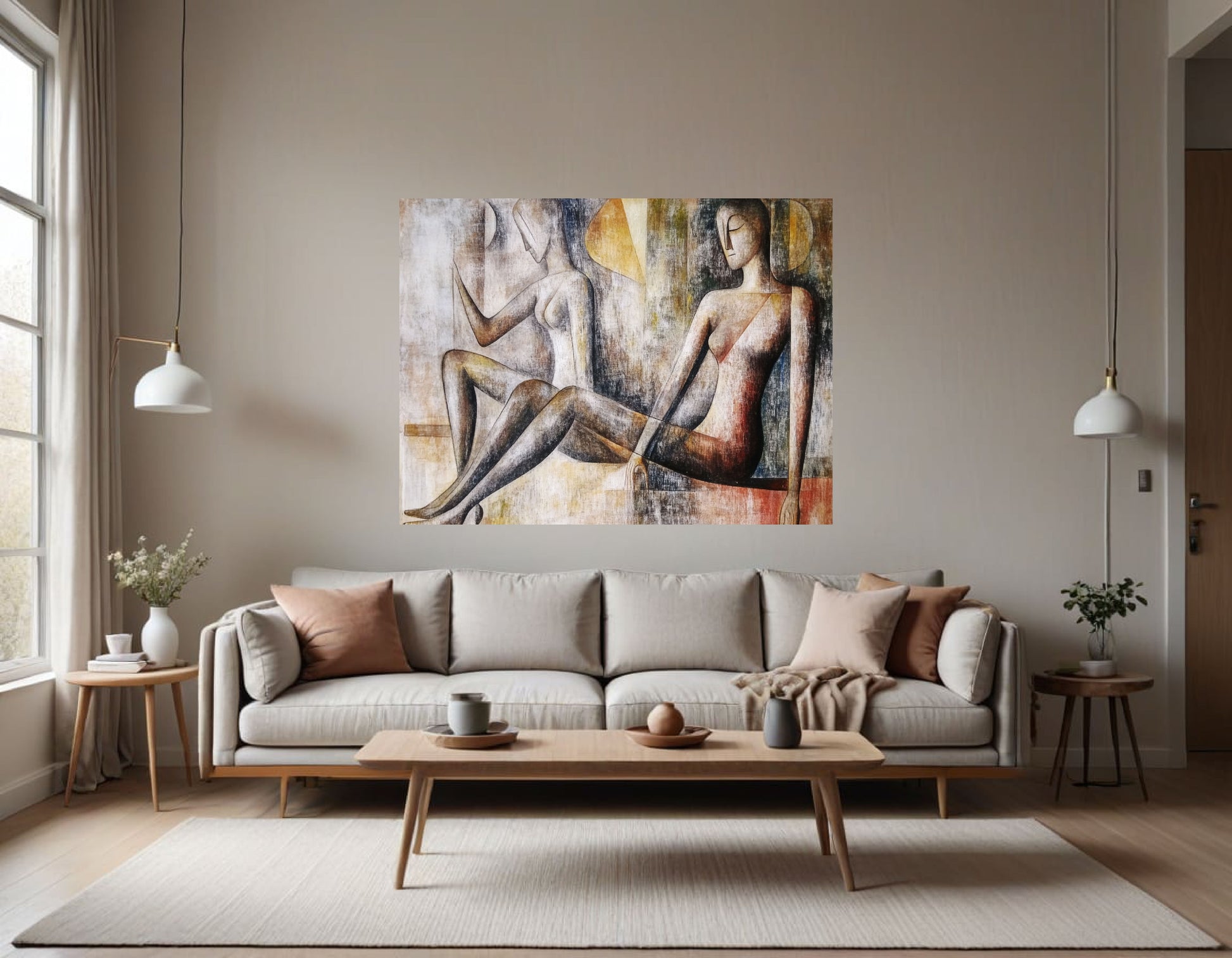The painting is a stylized depiction of two female figures, possibly nudes, rendered in a semi-abstract style that blends elements of Cubism and Expressionism. The figures are not realistically portrayed but are simplified and abstracted in form, emphasizing geometric shapes and planes.