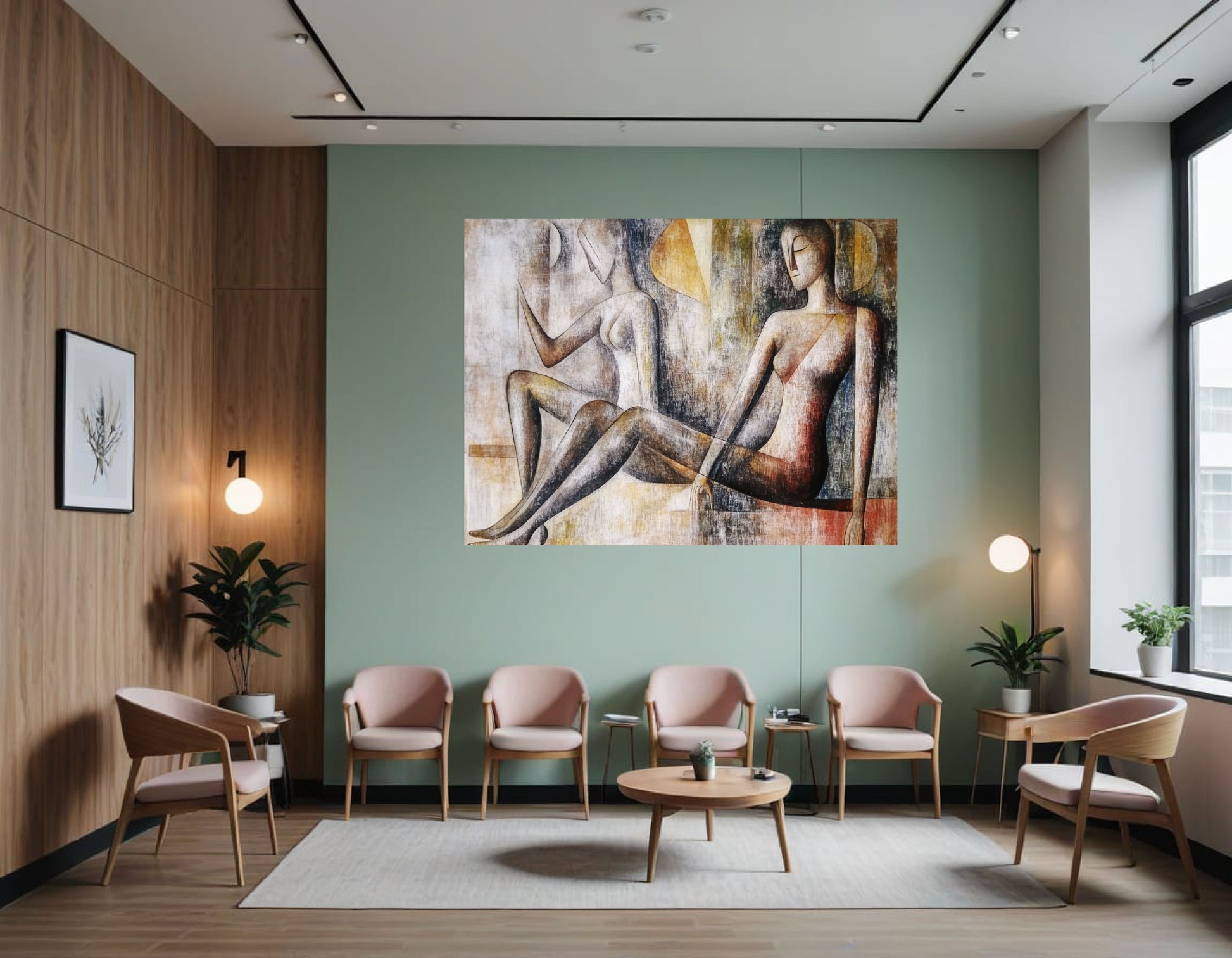 The digital painting is a stylized depiction of two female figures, possibly nudes, rendered in a semi-abstract style that blends elements of Cubism and Expressionism. The figures are not realistically portrayed but are simplified and abstracted in form, emphasizing geometric shapes and planes.