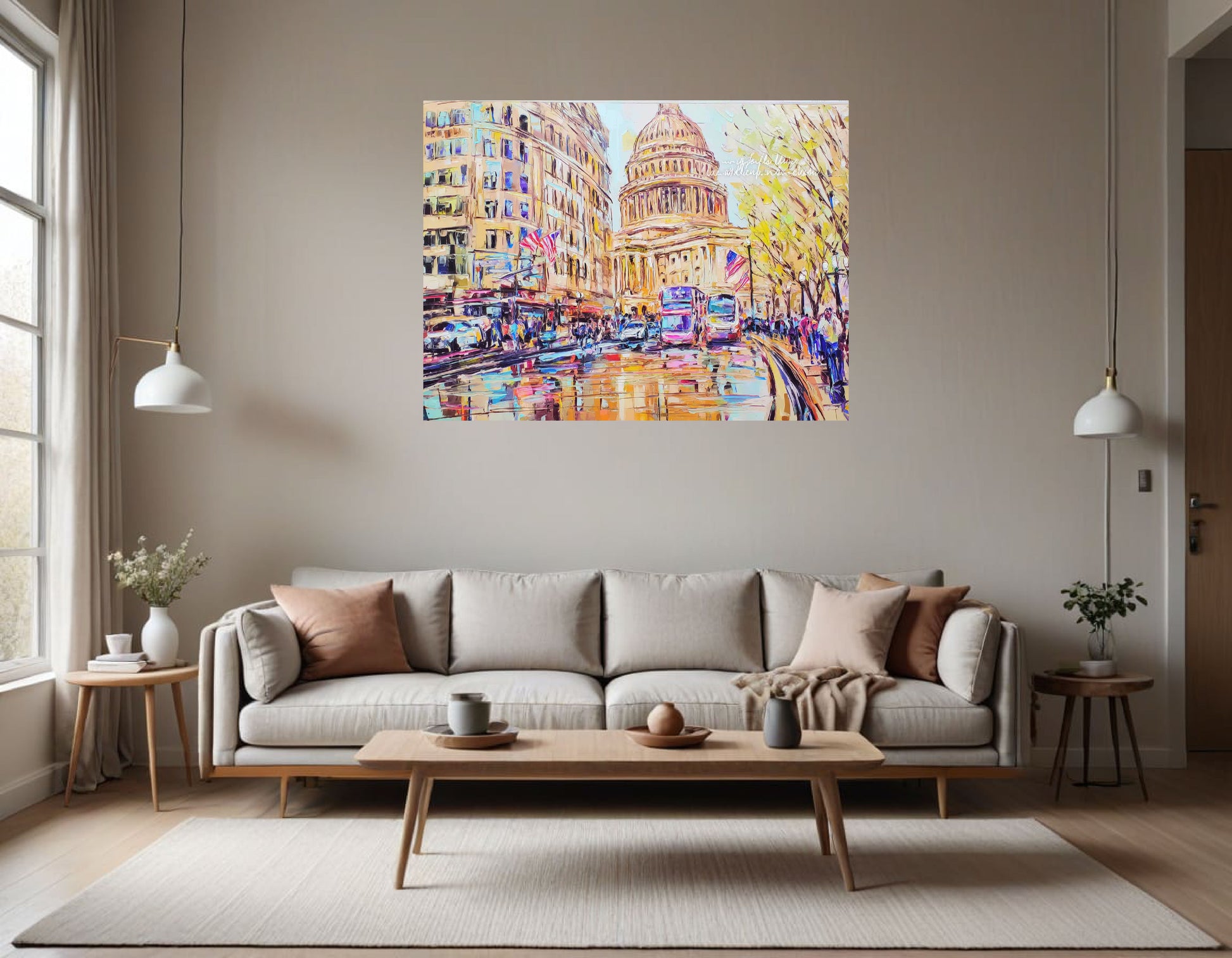 This is a vibrant, impasto painting of a bustling street scene in Washington D.C., featuring the U.S. Capitol Building as a prominent backdrop. The artwork is characterized by its thick, textured brushstrokes and a warm, dynamic color palette.