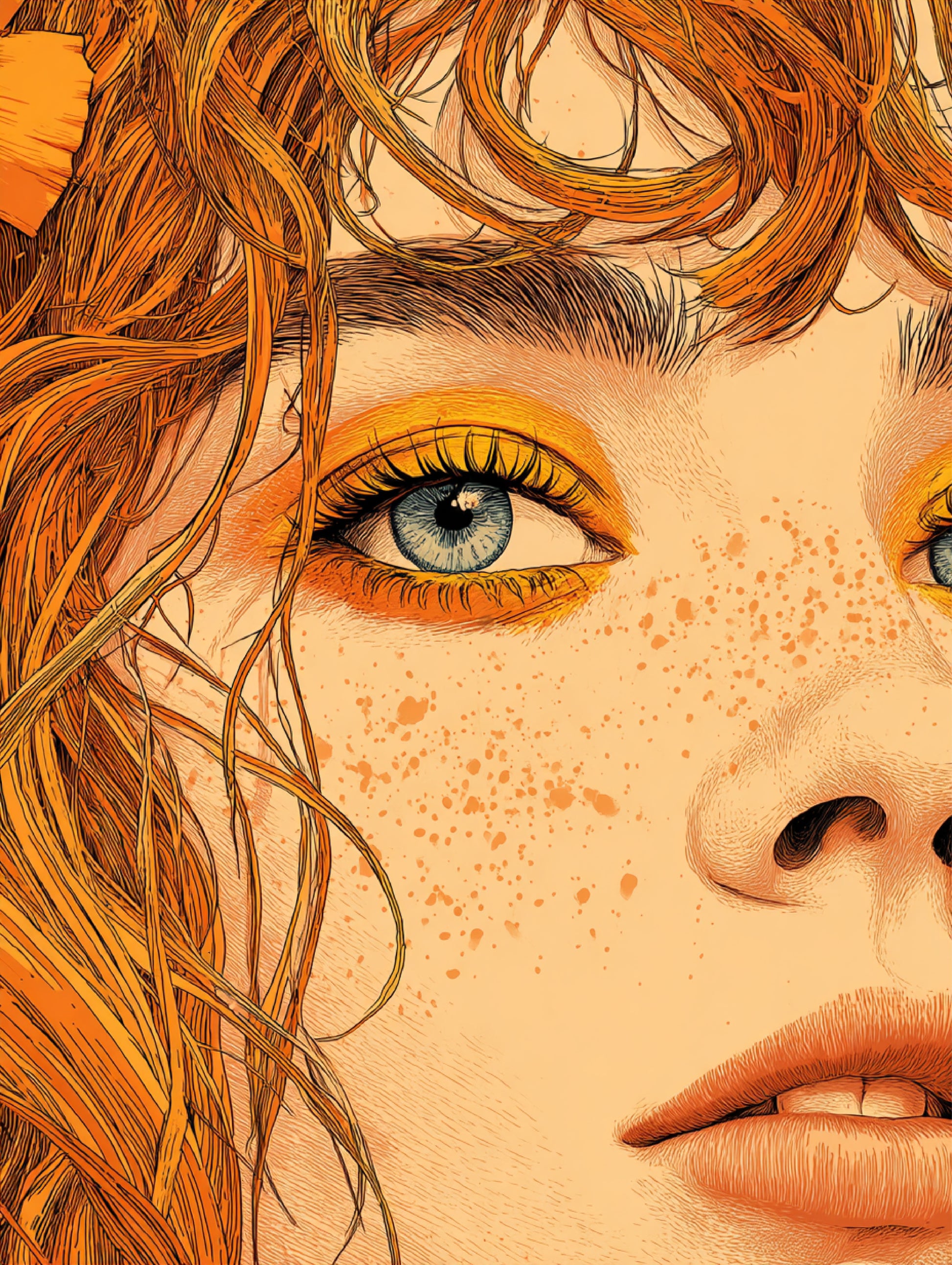 The painting features a dynamic and energetic background composed of swirling, textured lines in shades of orange, yellow, and brown. These bold, curved strokes create a sense of movement and depth, resembling tangled threads or flowing hair. The color palette is dominated by warm tones, evoking a lively and vibrant atmosphere. The use of intricate linework and rich hues lends the artwork a sense of complexity and visual interest.