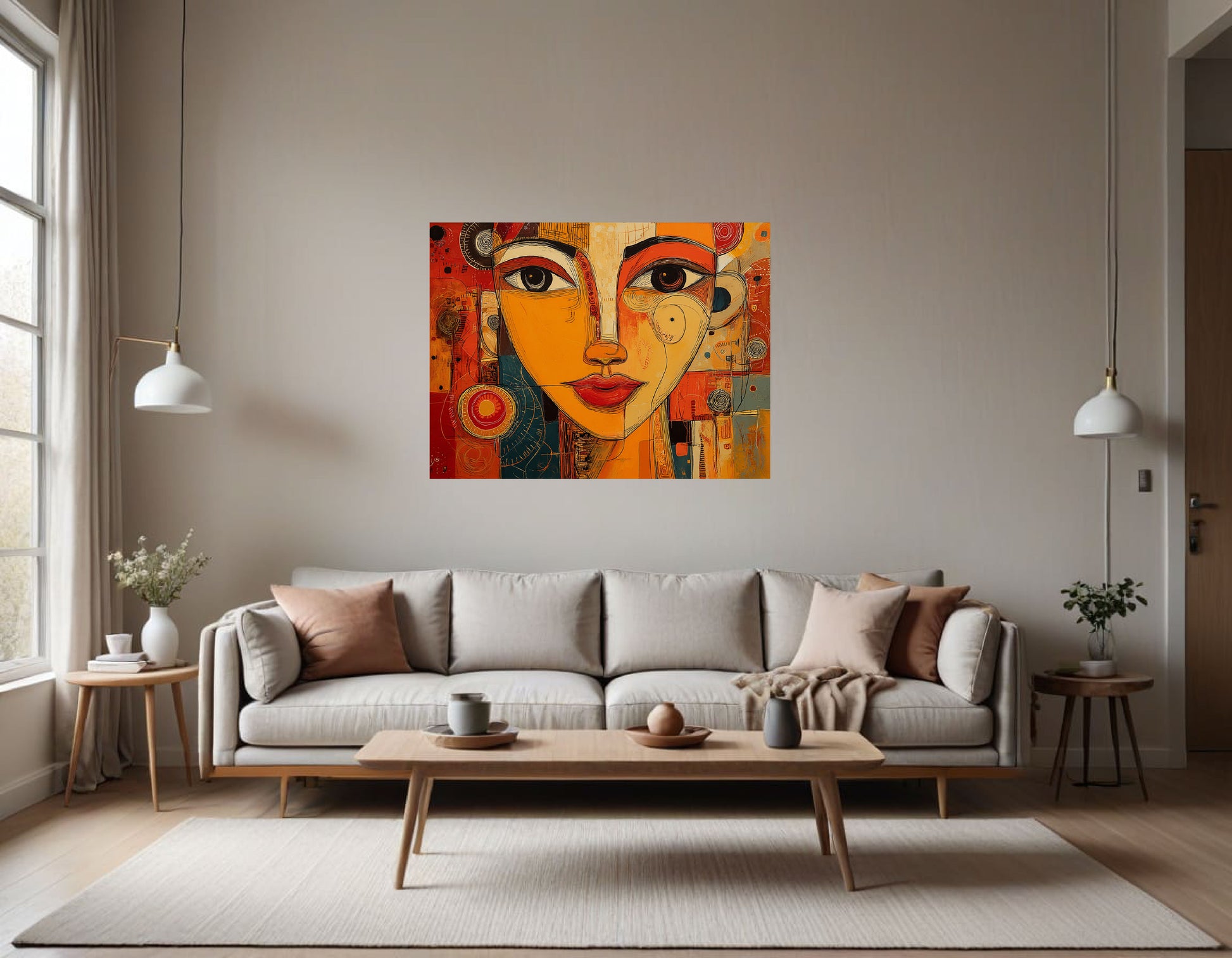 The digital painting features a vibrant abstract composition with a strong use of geometric shapes, swirling lines, and bold colors. The background is dominated by warm reds, oranges, and yellows, balanced by cooler accents of blue and off-white. Concentric circles, spirals, and squares are integrated in a dynamic, layered arrangement, with intricate linework adding depth and complexity. The overall effect is energetic and rhythmic, suggesting movement and interconnectedness within a modern, abstract style.