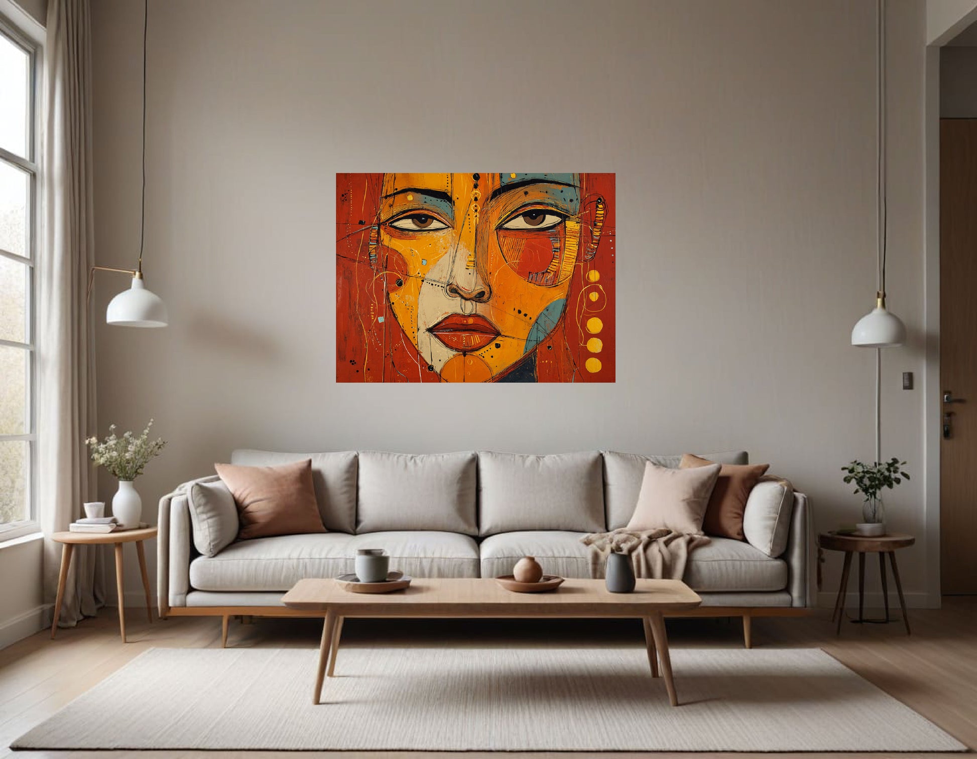 The digital painting features a vivid red border adorned with abstract patterns and sporadic marks. Along the edges, there are black curved lines, dotted white and black spots, and hints of yellow accents, giving a sense of movement and rhythm. The red background on the sides has textured variations, adding depth and visual interest. The central area is filled with a gradient of warm orange and brown hues, creating a smooth, glowing effect that contrasts with the more dynamic elements on the border. The overall composition conveys energy while maintaining a balanced warmth throughout.